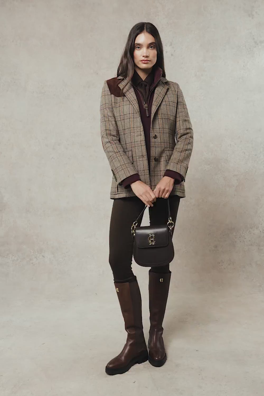 This Holland Cooper Country Ladies Fleece Quarter Zip Jumper is expertly constructed using technical polar fleece fabric for maximum warmth and comfort. Ideal for layering, it features contrasting faux leather piping detail, subtle HC embroidery on the chest, and unique quilted fleece elbow patches for enhanced comfort. The hidden seamed pockets provide a sleek and tailored fit whilst adding convenience. The finishing details include iconic Holland Cooper antique brass fastenings and metal hardware.