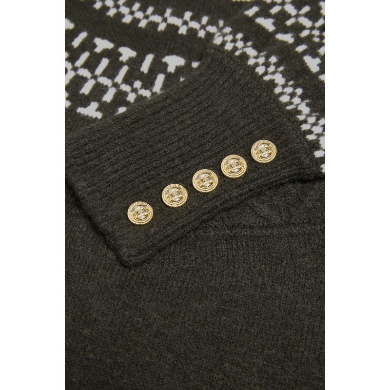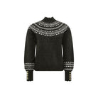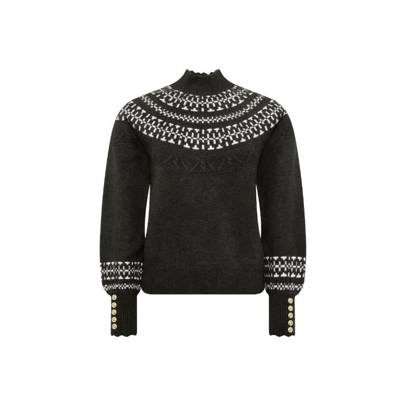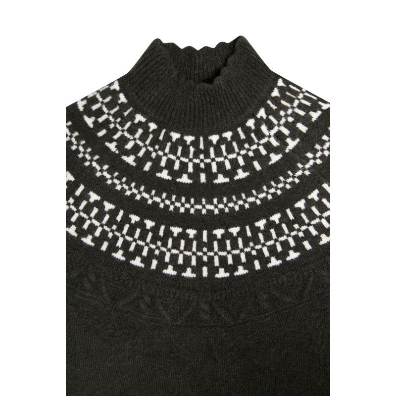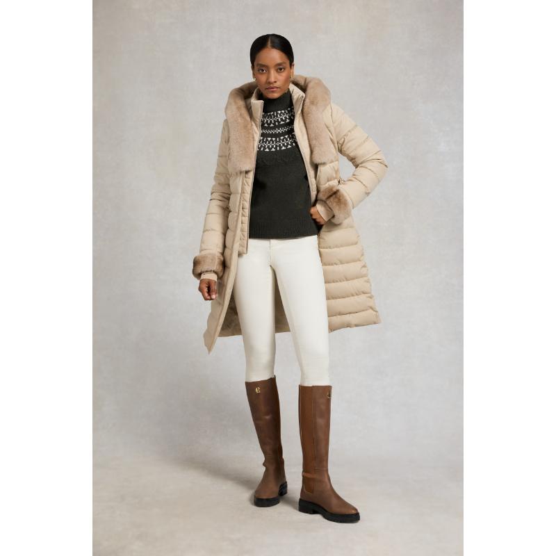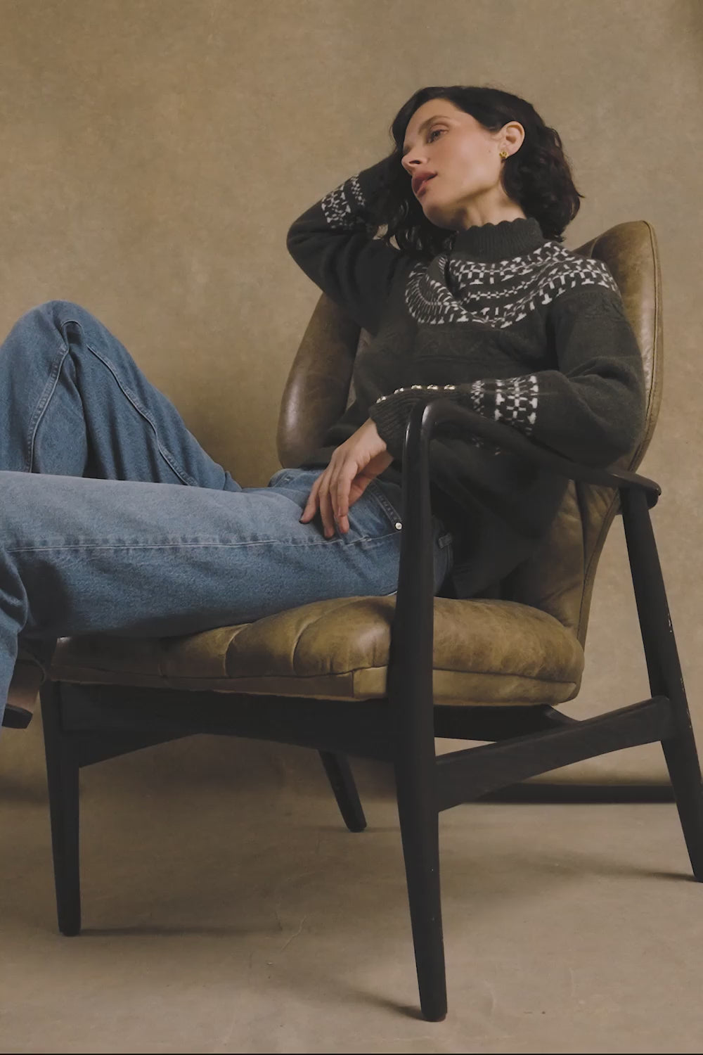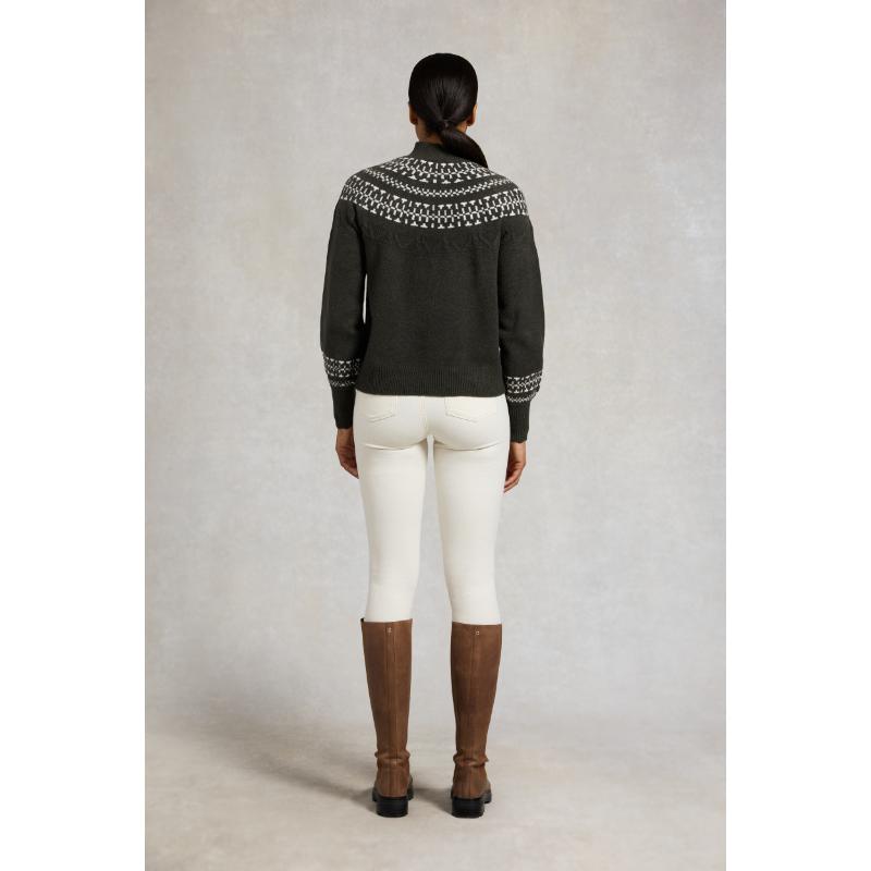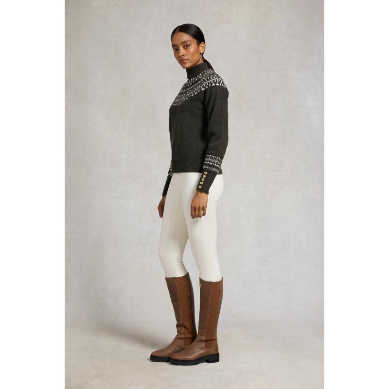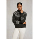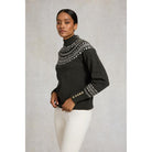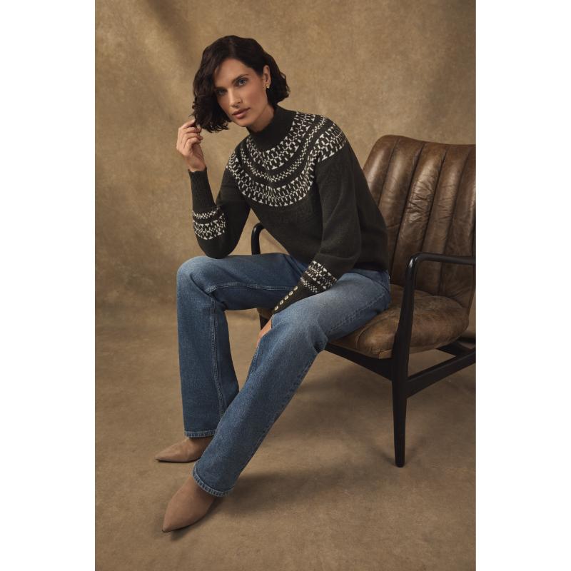 The Holland Cooper Elodie Roll Neck Knit Jumper expertly blends timeless design with detailed craftsmanship. It features a classic Fair Isle pattern enhanced by cable knit accents and voluminous raglan sleeves that add a feminine silhouette. The roll neck is finished with contrast scallop edging for a distinctive look, while signature hardware on the cuffs provides a sophisticated touch. This versatile jumper is ideal for layering or wearing alone, offering both comfort and refined style.