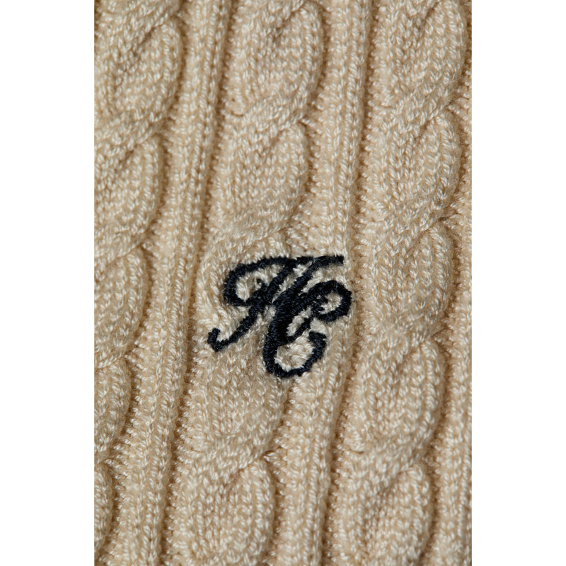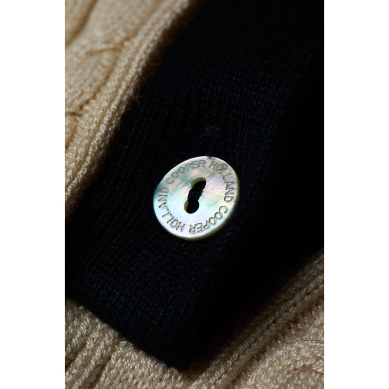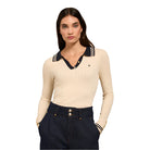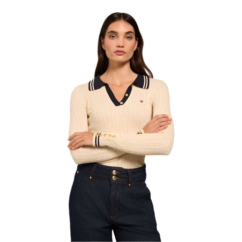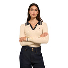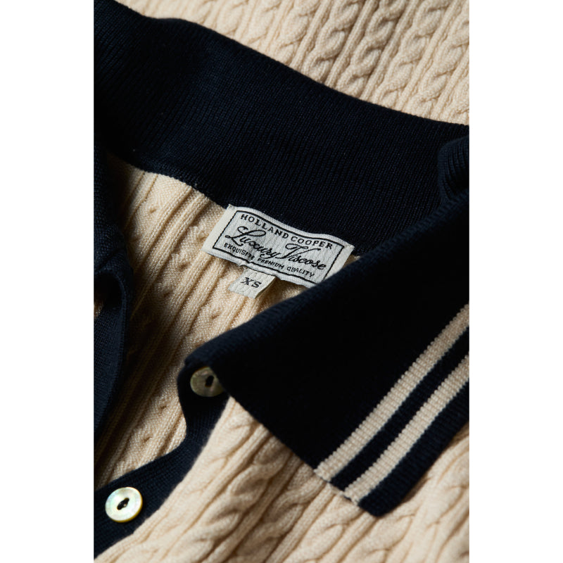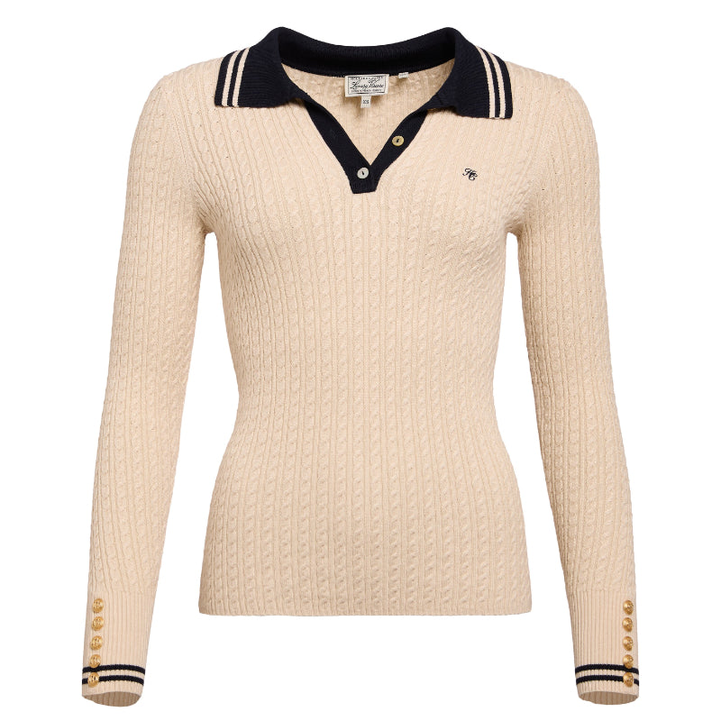 The Holland Cooper Orla Ladies Knit Jumper in Almond is a slim-fitting, elegant garment featuring delicate cabling for added texture. The contrasting collar and placket offer a modern touch, while the branded shell buttons and HC embroidery on the chest add sophistication. Completed with signature gold details, this piece is the epitome of timeless style.