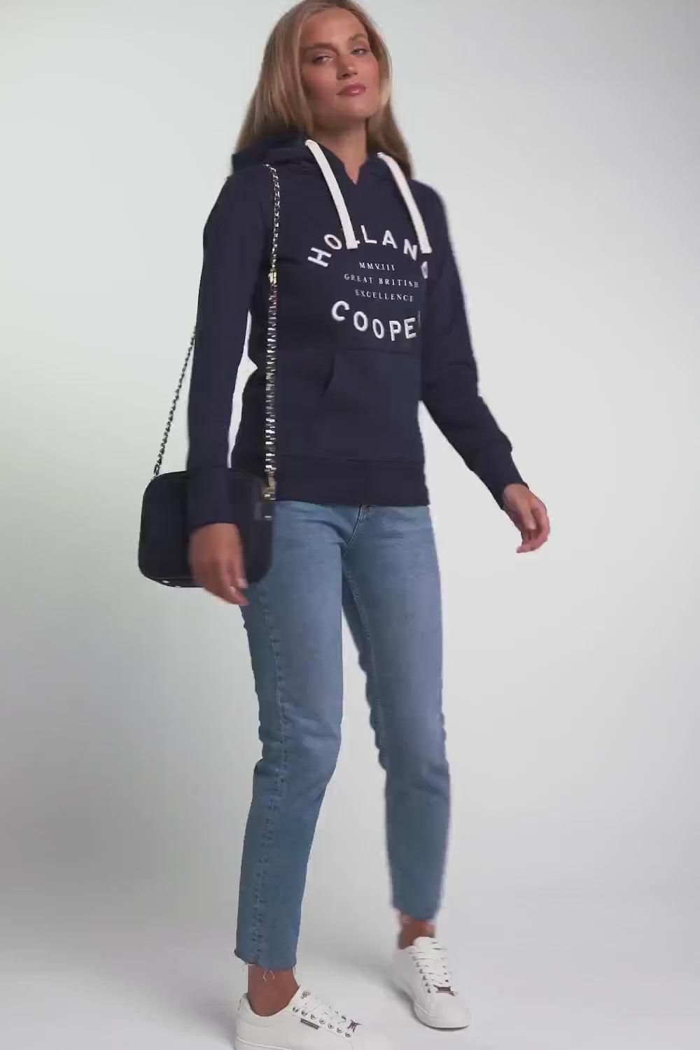 The Holland Cooper Varsity Ladies Hoodie is the ultimate blend of comfort and style. Made with a soft cotton mix jersey, this relaxed fit hoodie features a kangaroo pocket and drawstring hood. With ribbed hem and cuffs and high build embroidery on the chest, it's elevated with iconic gold hardware.