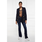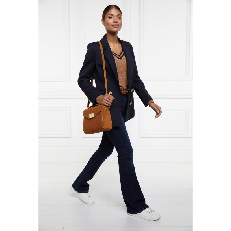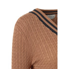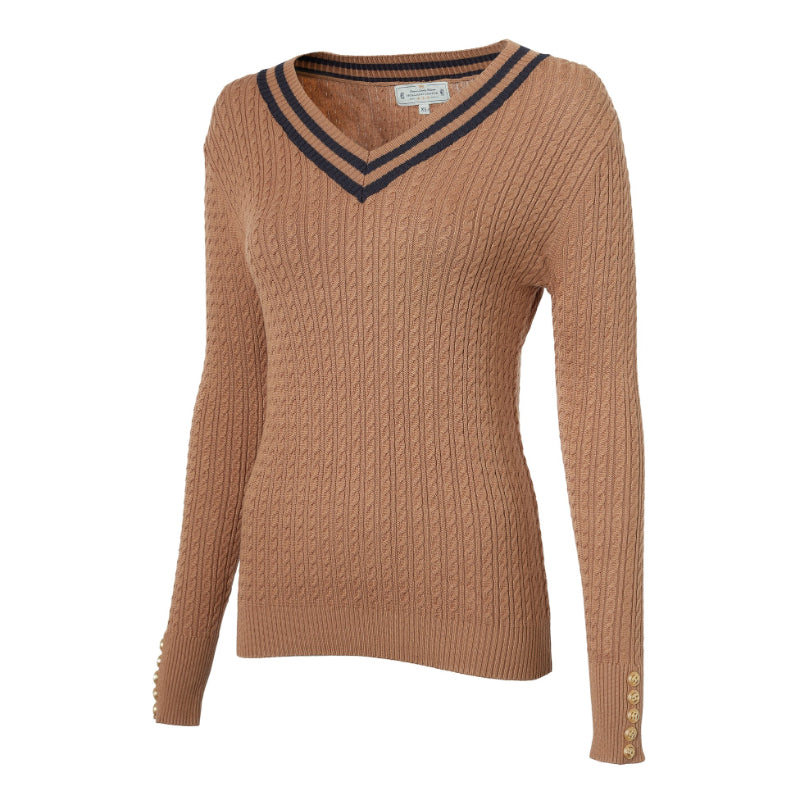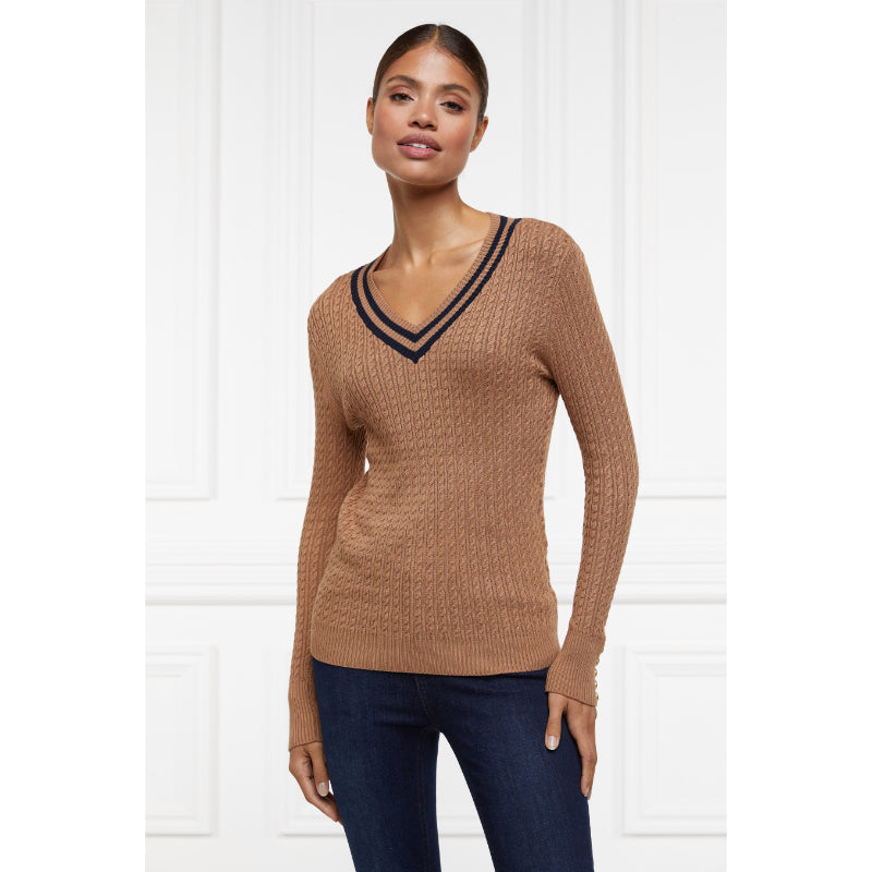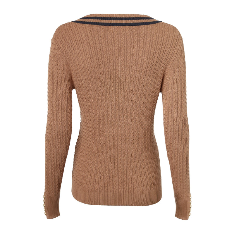 Made from a luxuriously soft blend of yarn, the Holland Cooper Zoe Ladies Knit Jumper features a sleek silhouette and deep v-neckline. Its distinct cable knit pattern and contrasting striped collar add a touch of sophistication to your daily wardrobe. Finished with signature Holland Cooper gold hardware on the cuffs.