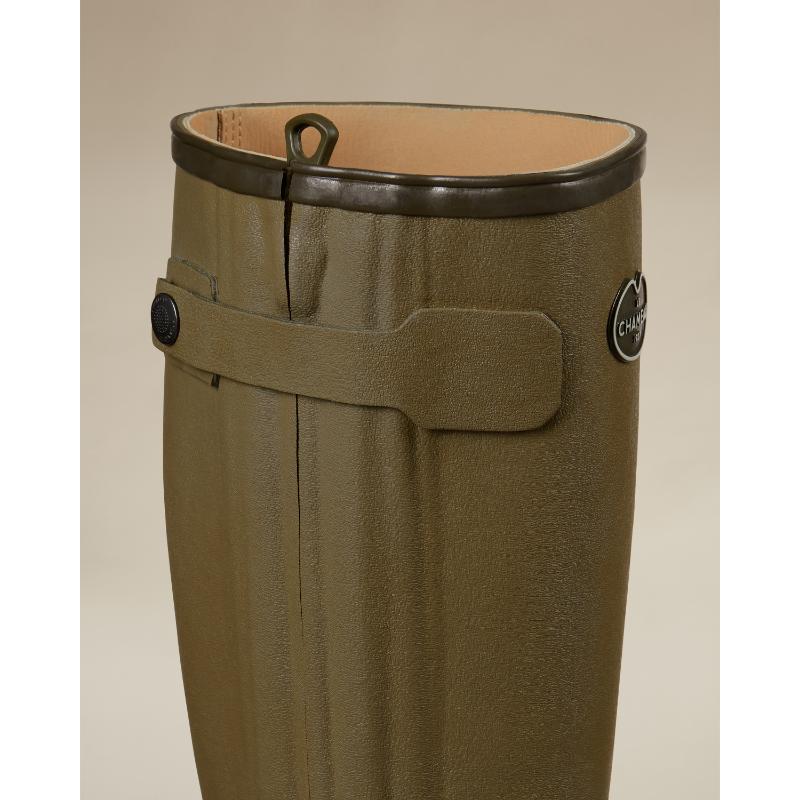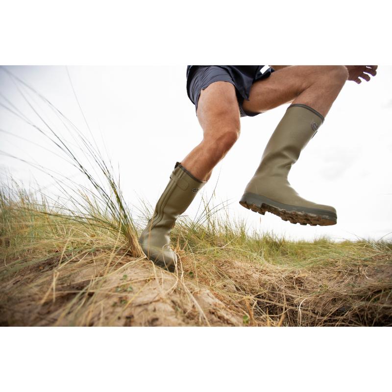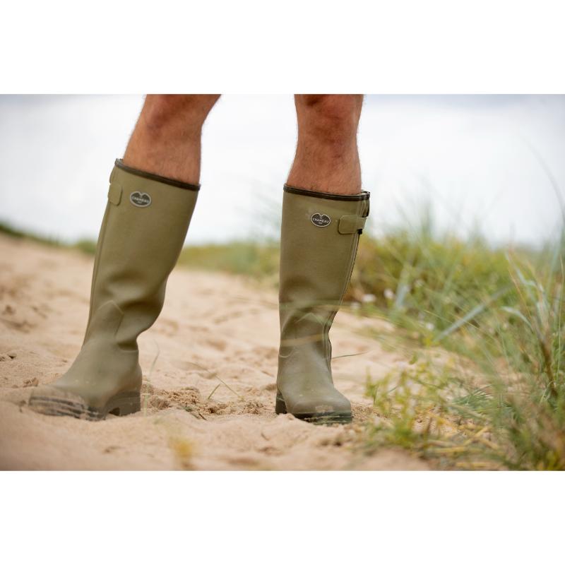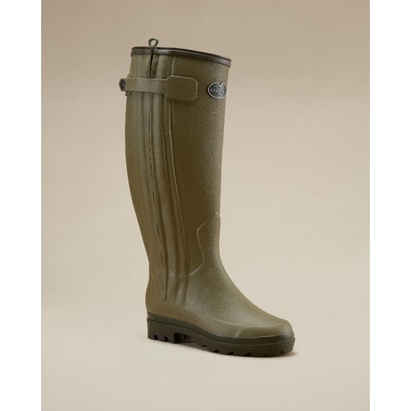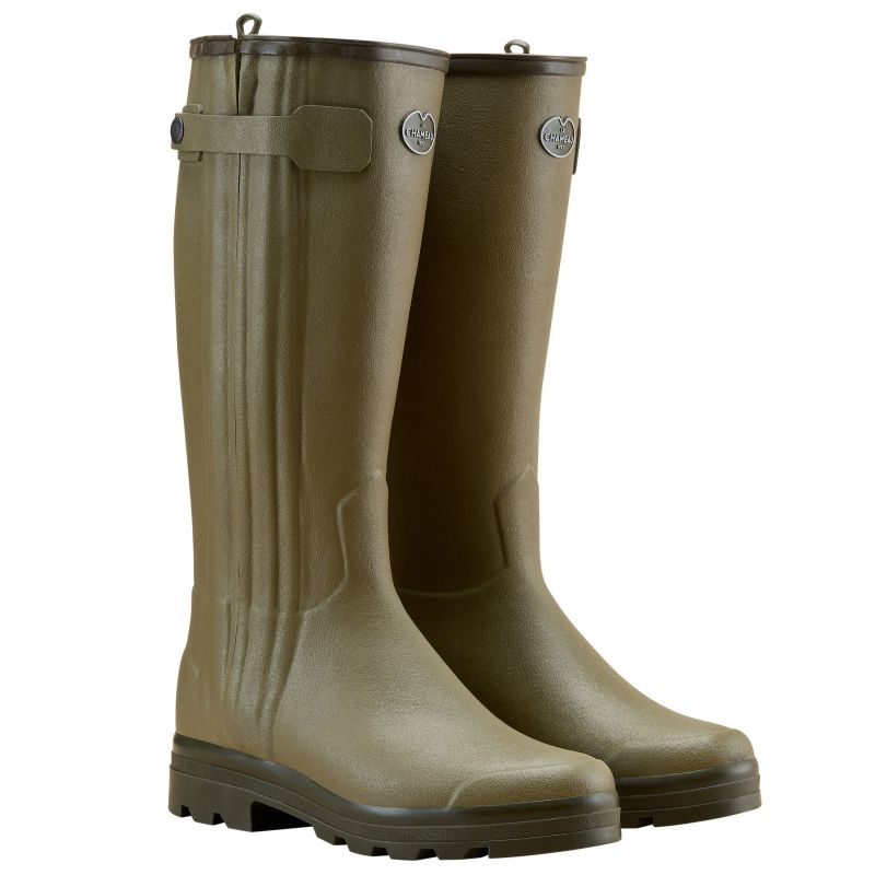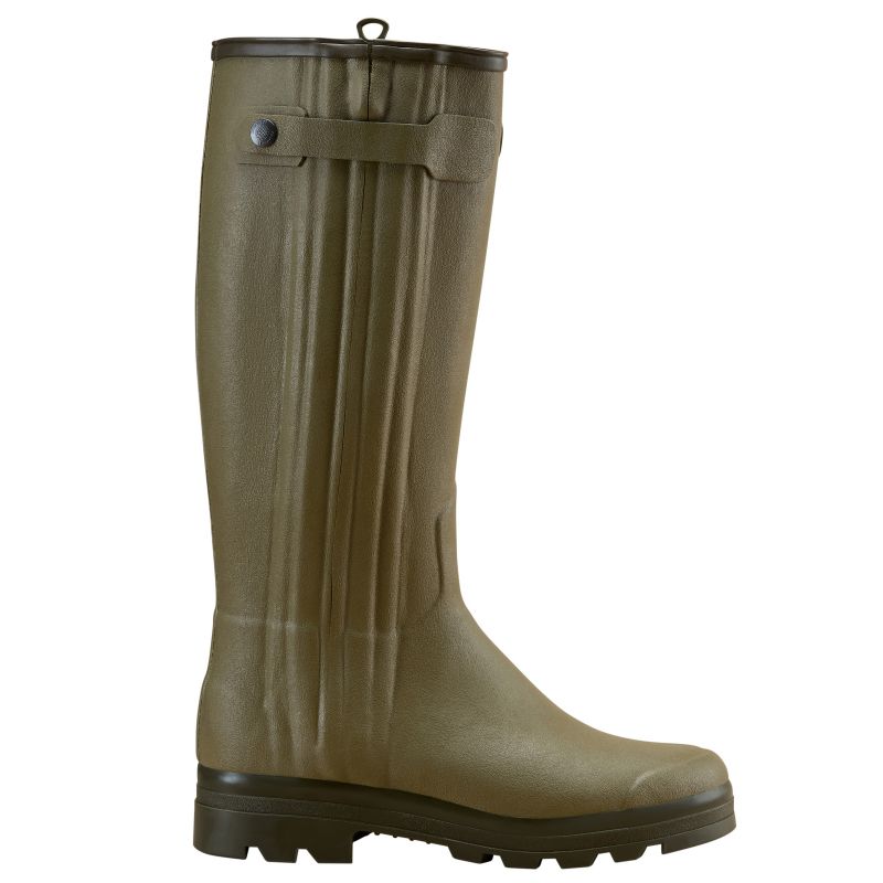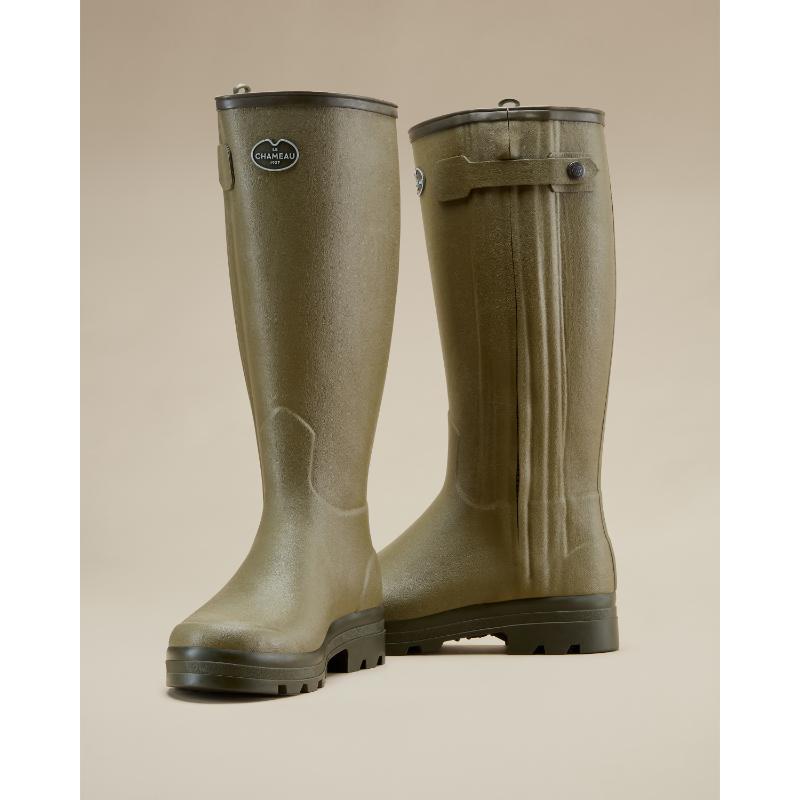 The Le Chameau Mens Chasseur Leather Lined Boot are the flag ship, leather lined wellington boot, famous by the name of "zip boot". The iconic sage green supple natural rubber upper is lined in luxuriously soft calf leather providing unparalleled comfort. The full length concealed side zip, with calf strap closure, ensures ease of entry for the wearer and an improved fit around the ankle. With a bi-density, all-terrain grip sole, resistant to abrasion, this boot is the ultimate; highly acclaimed worldwide.
