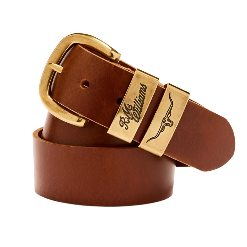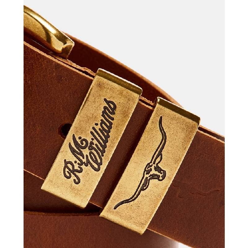 A simple belt can be the perfect finishing touch to your outfit and the R.M. Williams Drover 1 1/2" Mens Belt is the epitome of country style. Made in Australia from the highest quality vegetable tanned solid hide leather that is both soft yet durable, with a double keeper buckle and antique brass hardware. Cut in a 1 1/2-inch width and neatly finished with longhorn embossing and R.M.'s classic branding.