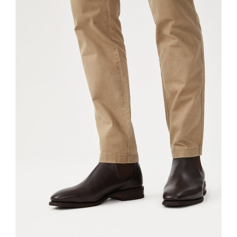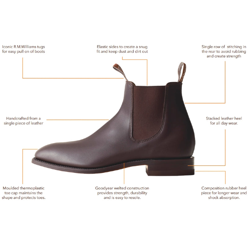 The iconic R.M.Williams Comfort Craftsman Boot is beautifully crafted from one piece of Kangaroo leather which is incredibly strong making these boots really durable and hard-wearing. Handcrafted in the Adelaide workshop, these boots feature a sewn welt non-slip composition sole and comfort innersole. Fully leather lined with a classic chisel square toe, flat heel, and woven pull-on front and rear branded tabs. A truly special pair of handcrafted boots that are perfect for smart or casual all year round.