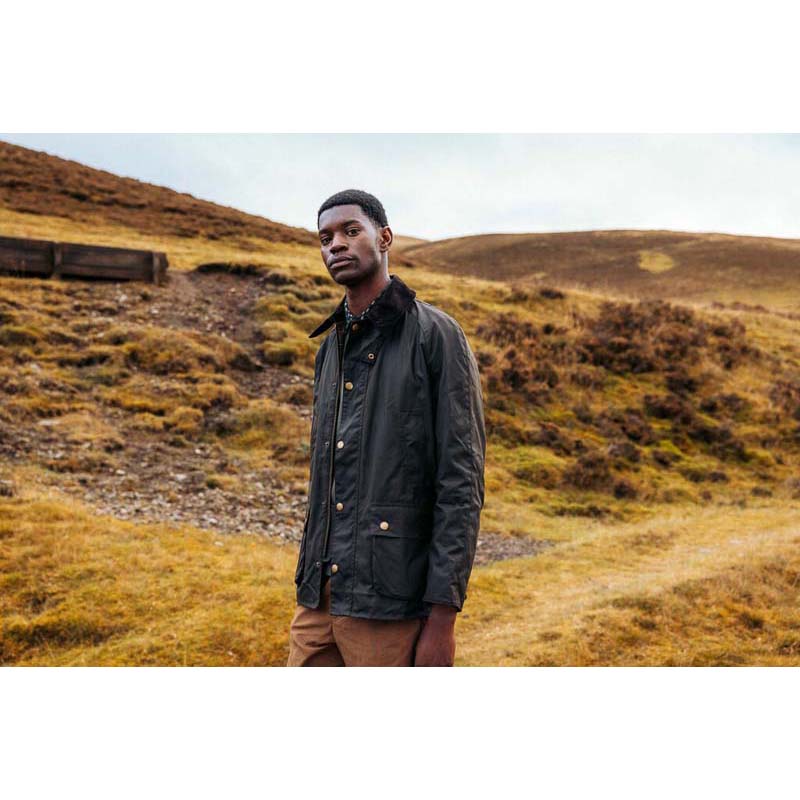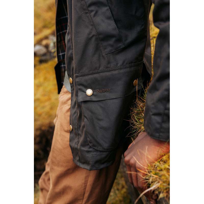 The Barbour Ashby Mens Waxed Jacket is a modern take on the classic Bedale jacket. It is designed with 6 oz Sylkoil waxed cotton, which has a matte finish and a cosy, worn-in feel. Classic features include a storm fly front with sturdy stud fastenings, a sophisticated sit-down cord collar with throat strap, angled handwarmer pockets, and two roomy bellow pockets. This jacket is slightly more fitted than the Bedale while still giving room for necessary winter layering. Lined with Barbours classic tartan cotton lining.