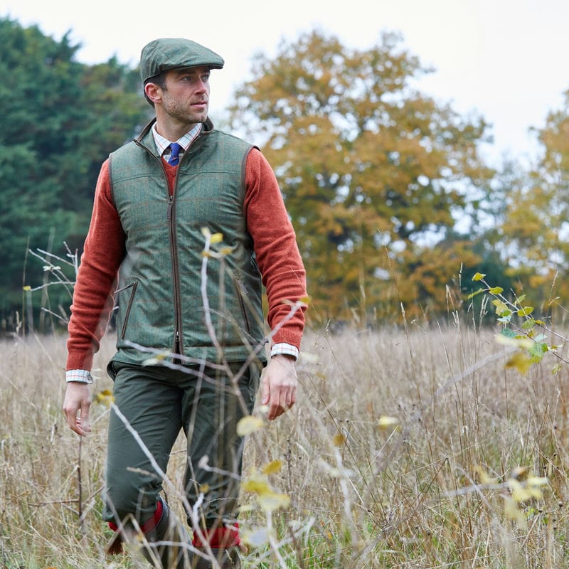 Stay warm in style with Alan Paine's Didsmere Mens Gilet. Cut from a breathable polyester tweed design, this gilet is insulated with luxuriously soft hollowfill wadding for extra warmth. It also features useful zip secured hand-warmer pockets, two secure internal pockets, and trim with faux leather binding for extra flair.