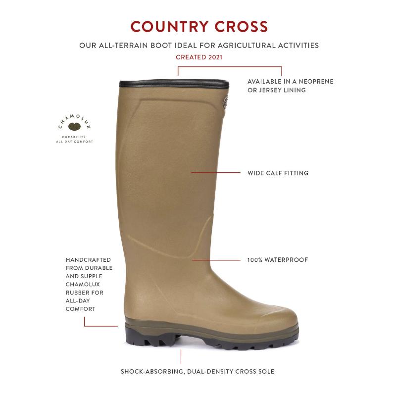 The Le Chameau Country Cross Neoprene Lined Mens Boot is a versatile and durable everyday wellington, built for supreme comfort and handcrafted from Le Chameau’s signature Chamolux natural rubber. Ideal for a range of country pursuits, from dog walks to full days in the field, these boots are 100% waterproof and feature a shock absorbing dual density cross outsole for support and grip in all terrains, whilst also reducing fatigue and cushioning your feet. Lined with 3mm neoprene, providing unbeatable insulation, preventing your body heat escaping ensuring your feet are kept warm in temperatures as low as -15*C. Soft and supple, these boots are designed to have a wider, sporting calf offering a more generous fit around the leg for comfort as well as performance.
