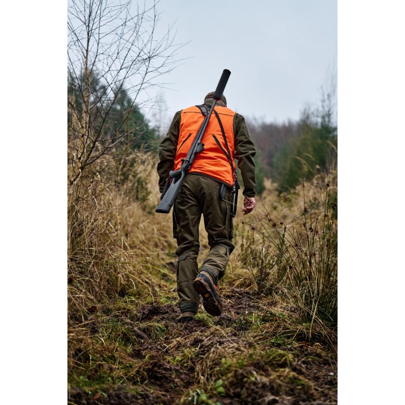 Premium waterproof trousers featuring GORE-TEX® membrane for complete weather protection in challenging hunting environments. Three-layer construction with DWR-treated tricot fabric and flannel lining delivers exceptional durability, warmth and comfort for serious hunters. Reinforced with Airtech fabric below the knees for durability against vegetation. Features waterproof pockets with cartridge holder, adjustable ankle straps, mesh-lined vents for breathability, and knee adjustment for mobility. Includes D-ring for gear and snow locks for dry comfort—all designed to optimize hunting performance.