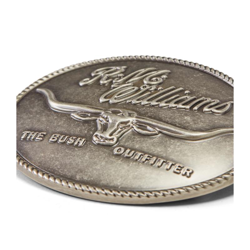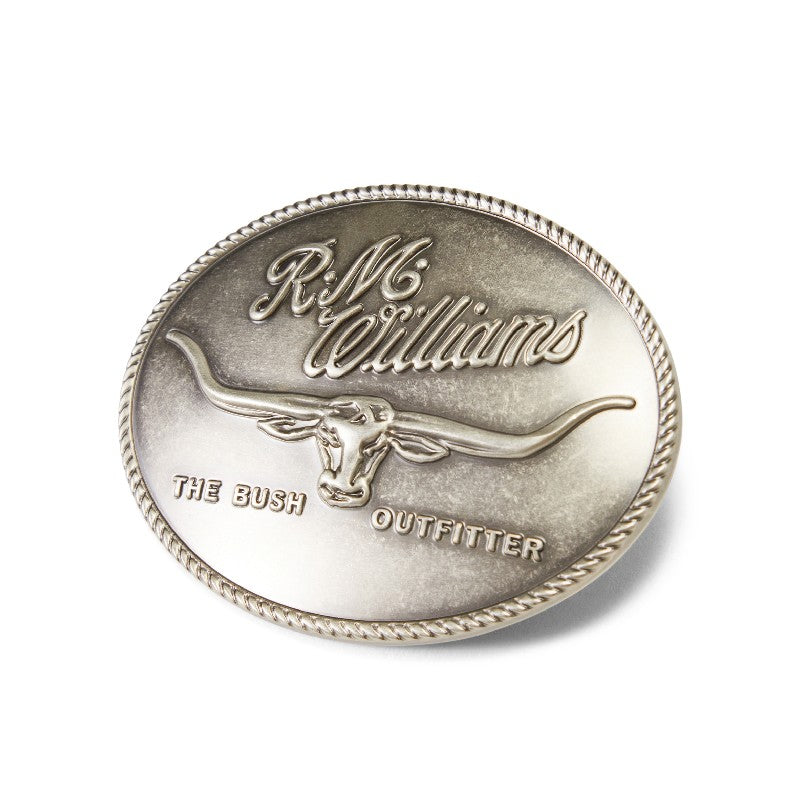 The R.M.Williams Logo Belt Buckle showcases the brand's timeless heritage and superior craftsmanship. With its elegant rope edge, iconic logo, and raised Longhorn detail, this western looking classic trophy-style buckle adds a touch of sophistication to any outfit. Pairs well with the RMW Traditional belt for a complete and polished look or a classic western style outfit.