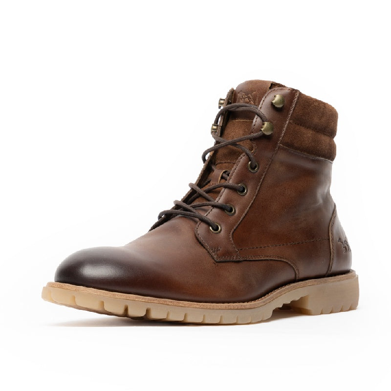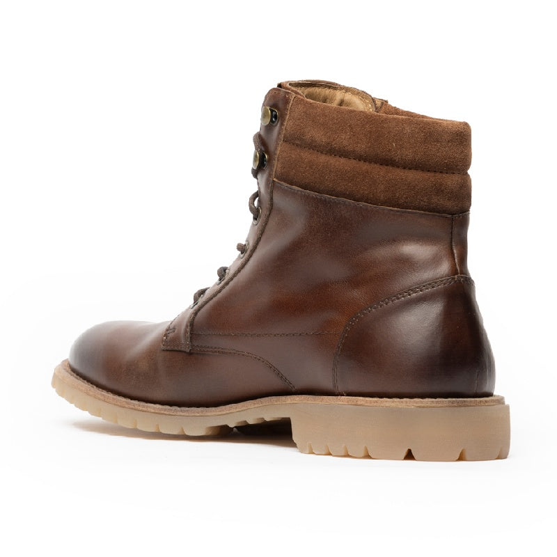 The Rodd & Gunn Clearbrooke Men's Military Boot combines premium soft USA leather with a retro-inspired design featuring a high shaft and padded collar for superior ankle support. Its leather and fabric lining enhances breathability, while the removable leather-covered moulded polyurethane footbed provides tailored comfort. The cleated translucent rubber outsole delivers exceptional flexibility and traction, ideal for all-day wear. The elevated shaft design offers versatile styling options, allowing you to either tuck in your jeans or fold the collar over for a distinct look.