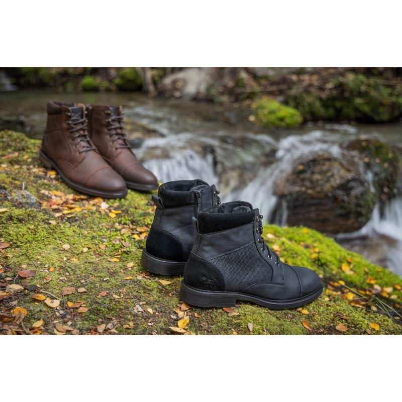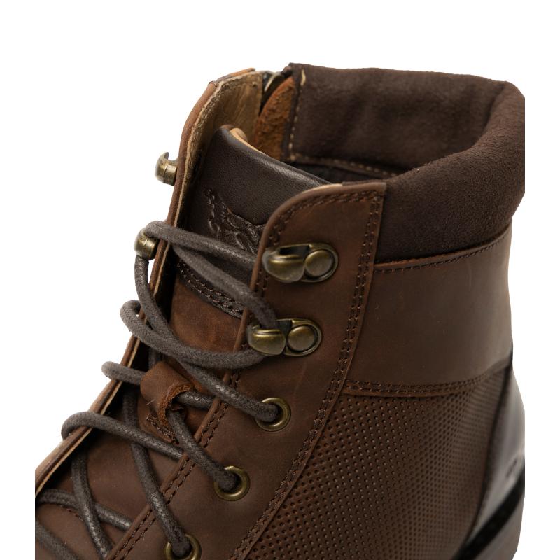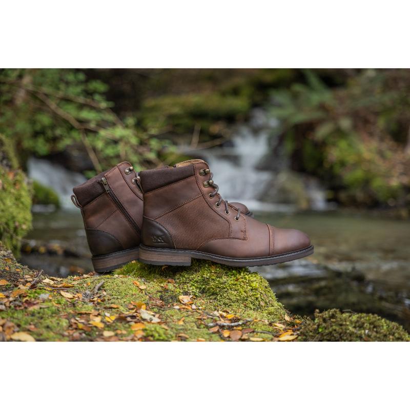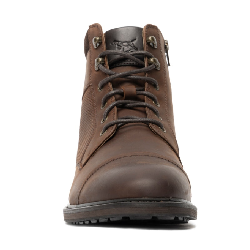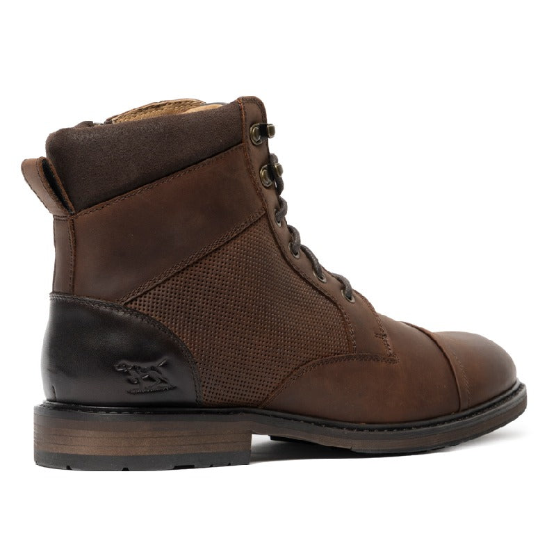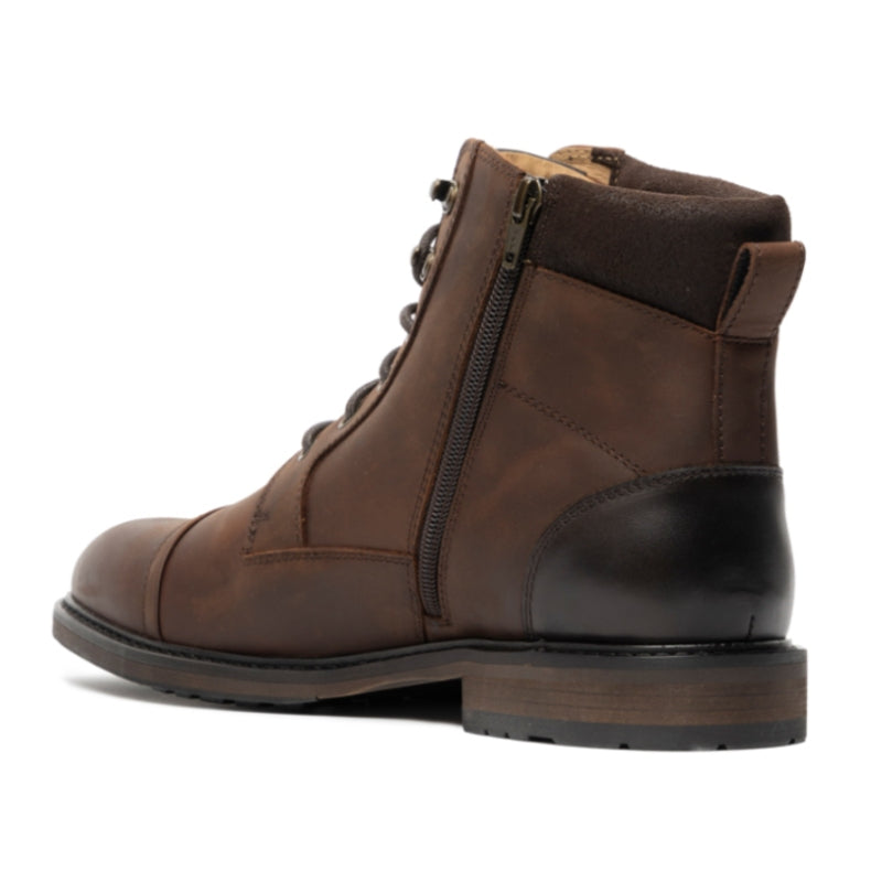 The Rodd & Gunn Durham Men's Military Boot blends rugged durability with refined style. Crafted from premium USA leather with matching suede collars and antiqued metal trims, it features a perforated waist panel and an inner YKK zip for easy wear. The leather and fabric lining, combined with a removable leather-covered moulded polyurethane footbed, ensures lasting comfort. Its two-tone cleated rubber outsole with a separate heel offers reliable traction, making this boot a versatile choice for both dress and casual occasions.