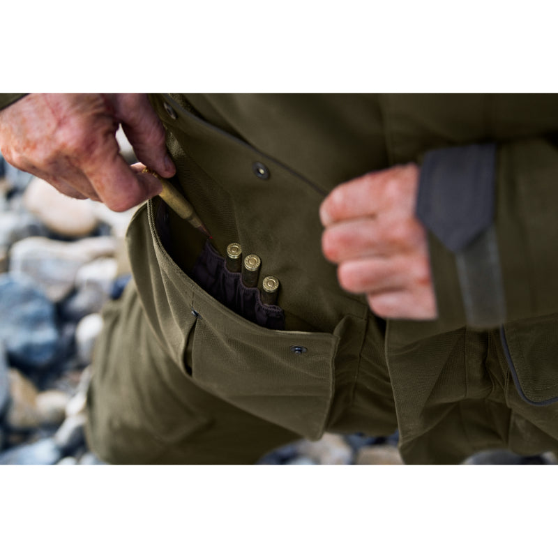 The Harkila Pro Hunter Endure Waterproof Jacket is an impressive update of the hugely popular Pro Hunter X. Traditionally styled for a smart, discreet look without compromising on functionality. Using highly breathable Airtech technology with a waterproof, windproof and breathable GORE-TEX membrane. Crafted from Durable Water-Resistant heavy canvas fabric with lightweight, durable Cordura reinforcement. Featuring a wired peak detachable hood, large waterproof cartridge pockets with drainage holes and side pockets behind, hand warmer pockets with retainer straps, radio pocket, two-way front zip, game pocket and a handy napoleon pocket. Innovative and dependable, a Pro Hunter suit will perform and withstand inclement weather for many years to come. Harkila offer a five-year warranty on the fabric, this suit is that good.