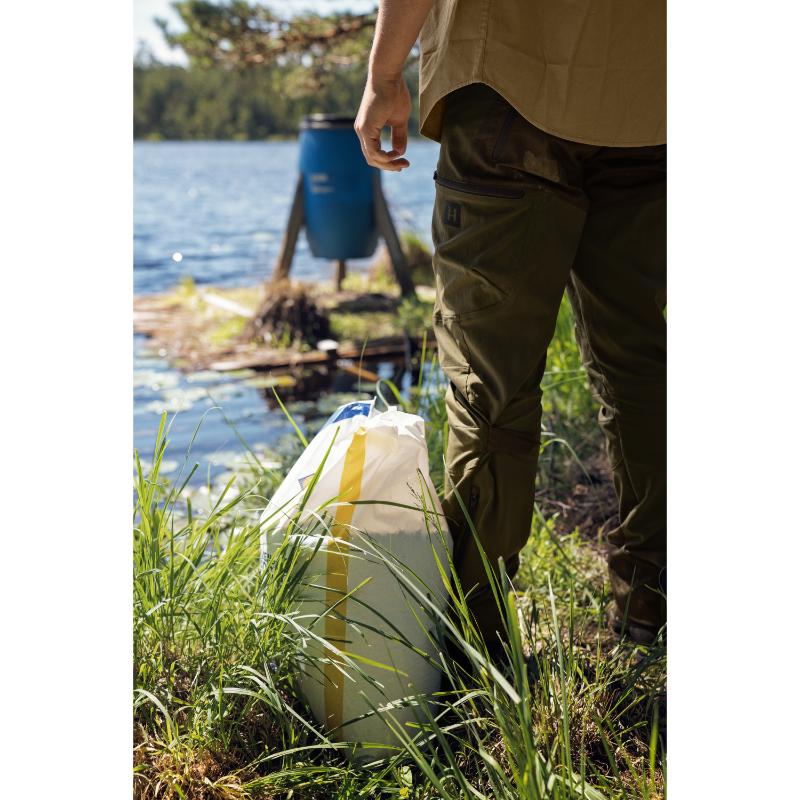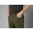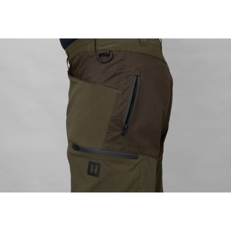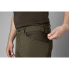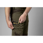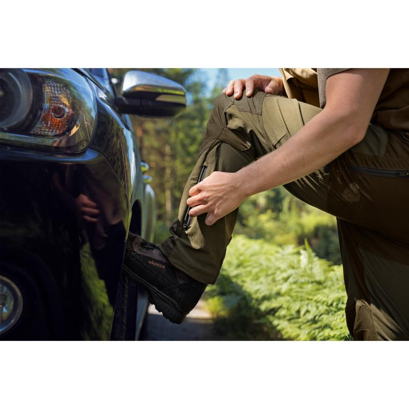 The Harkila Ragnar Mens Trousers combine functionality with comfort through their 96% nylon and 4% spandex construction. These DWR-treated trousers repel water and dirt effectively without a membrane. Featuring articulated knees and full stretch fabric, they offer exceptional mobility for active pursuits. Practical details include thigh pockets with cartridge holders, ventilation zips, adjustable leg hems, and an anti-slip waistband. The jeans-style button closure and D-ring belt loop enhance both utility and style for the discerning outdoorsman.