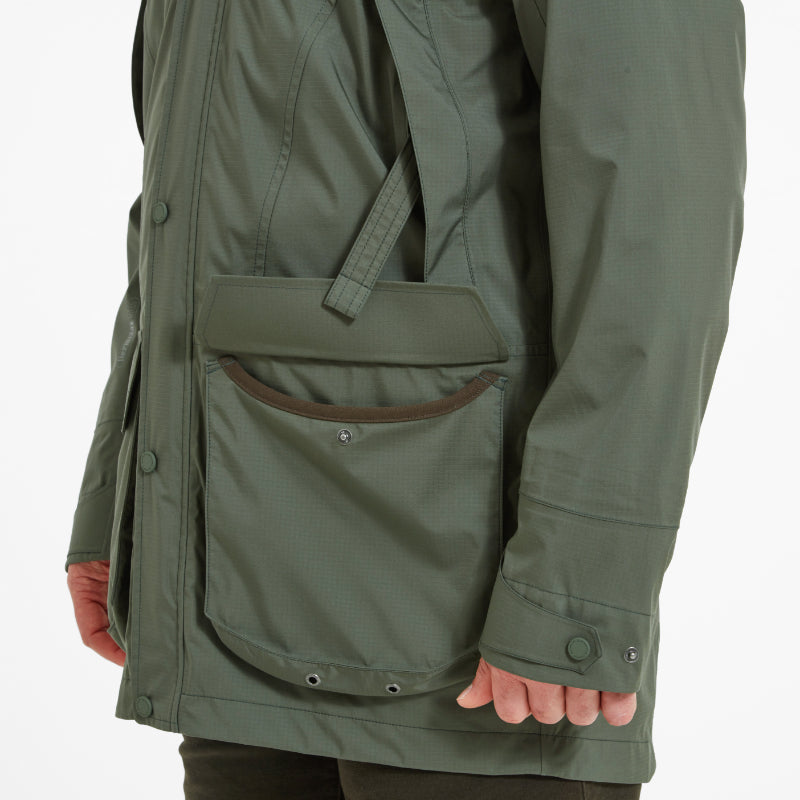 The Schöffel Ptarmigan Cirrus Mens Coat is billed as the German brand’s lightest ever waterproof, breathable and windproof shooting coat. The coat is bursting with features, including a durable water repellent finish, a contemporary sports cut with underarm gusset and a recoil pad which can be inserted into either the left or right shoulder: perfect for busy days on high birds. Microfleece-lined hand warmer pockets with storm flaps sit above two large bellow cartridge pockets complete with retainer straps for easy access. The coat also features storm cuffs, a two-way YKK zip with popper closures and a detachable, adjustable and storable hood. Machine washable and quick drying.