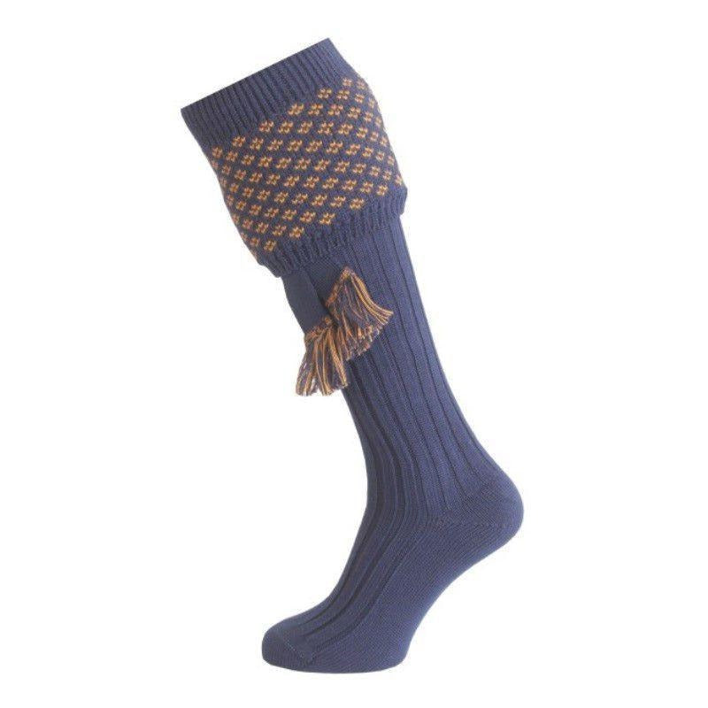 William Powell Boughton Mens Merino Shooting Socks with Garters - Navy/Ochre