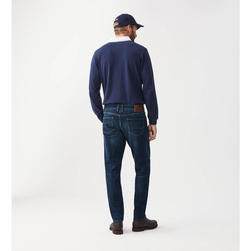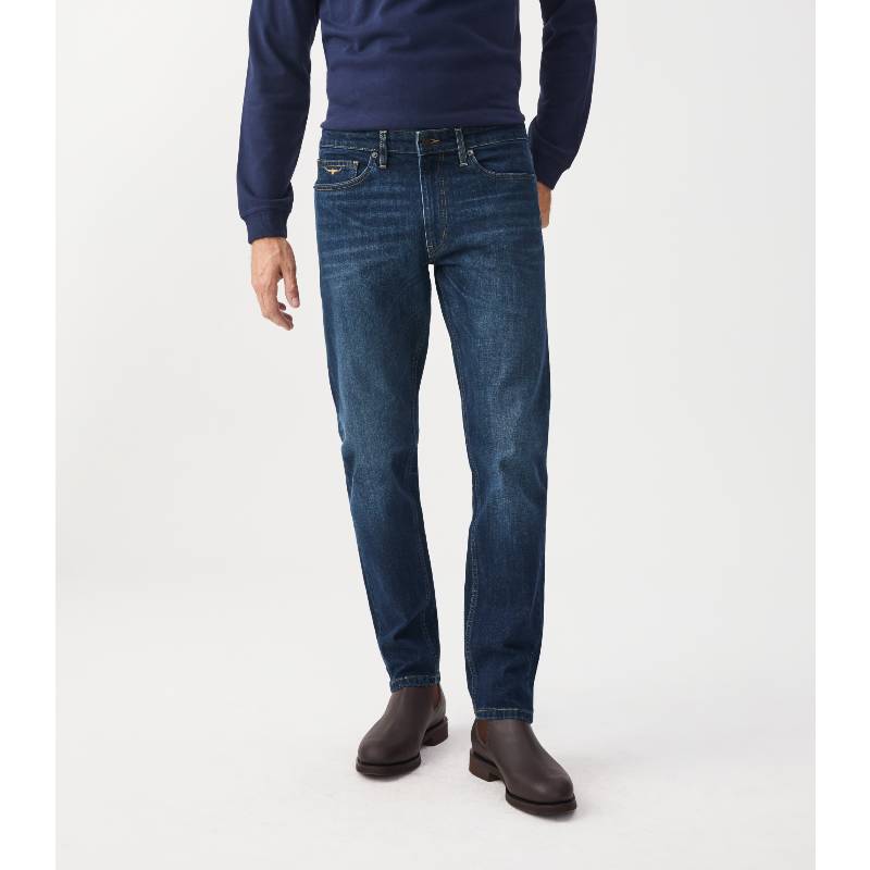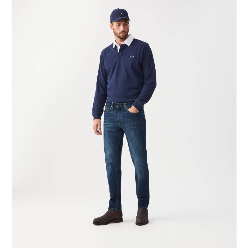 The R.M. Williams Loxton Mens Denim Jeans are crafted from a cotton mix with a hint of elastane for that extra freedom when moving about town. The jeans have a 5-pocket design, along with a tapered leg for a more contemporary look and R.M. Williams branding throughout. Machine washable.