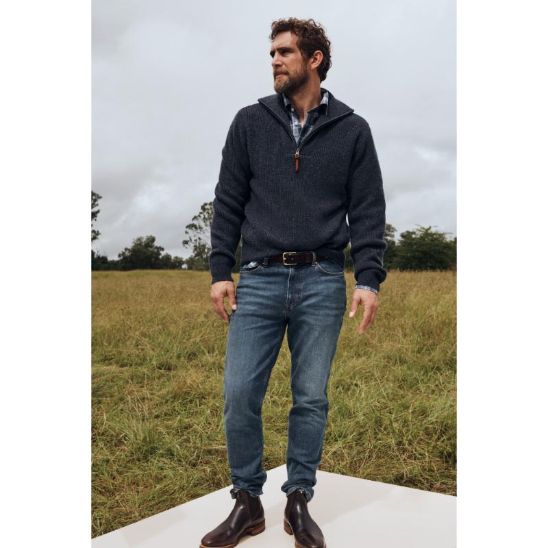 The RM Williams Mens Ramco Denim Jeans are more comfortable than ever due to the hint of elastane within the 13.5oz weighted denim cotton. These jeans have a regular fit with a straight leg and low rise waist. RM Williams signature branding features throughout from leather waist patches to Longhorn styled stitching. Proper, dependable 5 pocket jean ideal for everyday use. Machine washable.