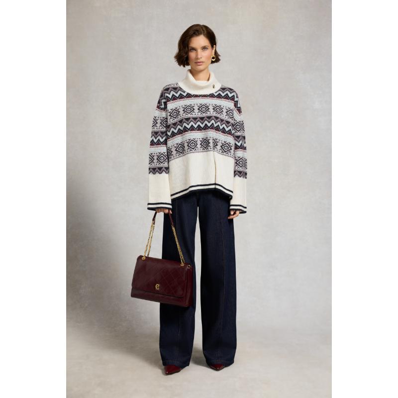 This sophisticated Holland Cooper knit combines heritage craftsmanship with contemporary ease. The sumptuous mohair blend delivers luxurious softness, while the relaxed silhouette and stepped hem create an effortlessly polished aesthetic. Signature Fair Isle detailing adds visual interest and seasonal appeal, complemented by the branded HC plaque at the roll neck—a hallmark of refined design. Wide ribbed cuffs ensure practical layering capability, making this piece exceptionally versatile. Whether styled with tailored trousers for elevated occasions or paired casually with denim, this roll neck represents a considered investment in timeless knitwear that transcends seasonal trends.