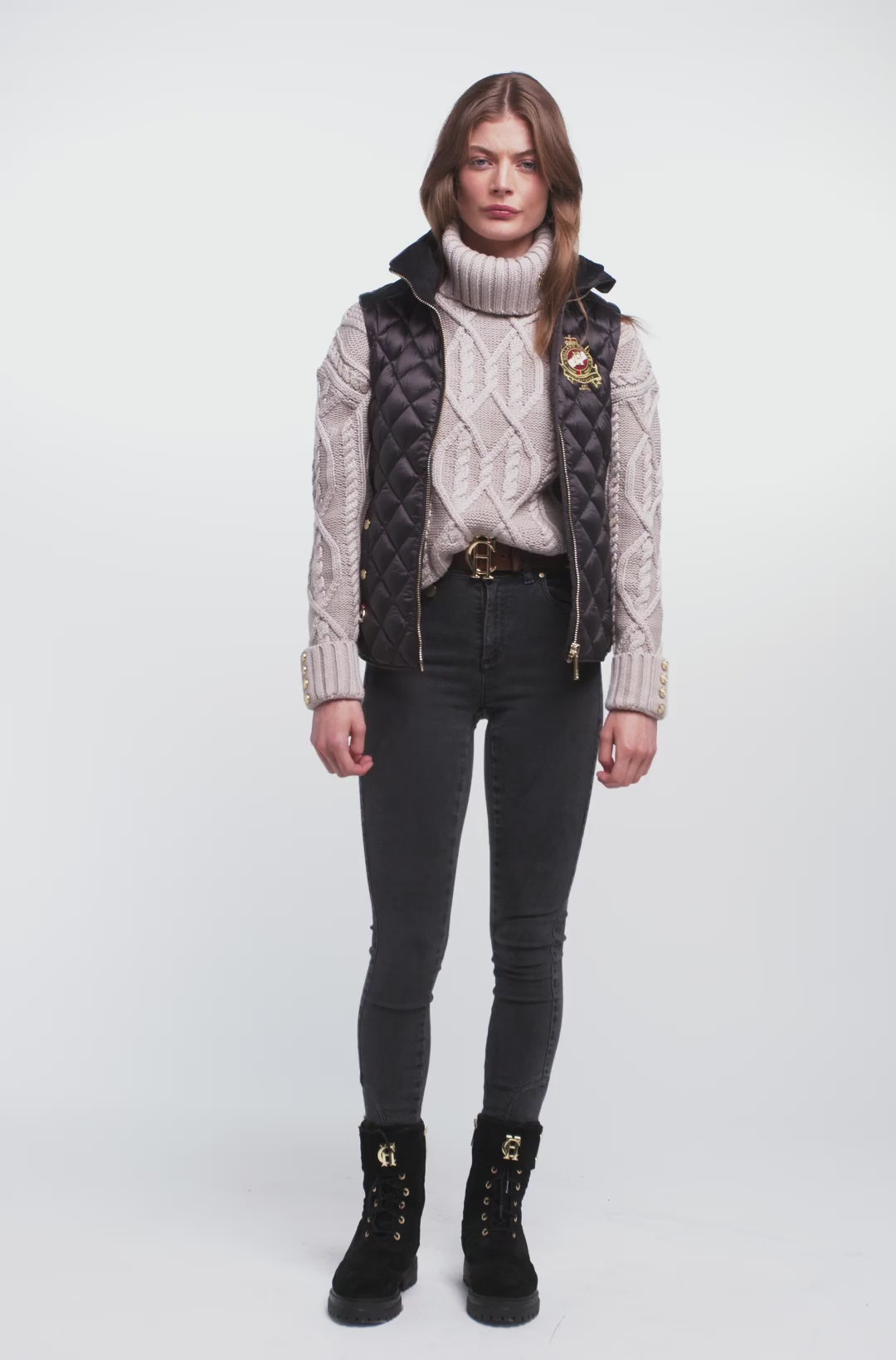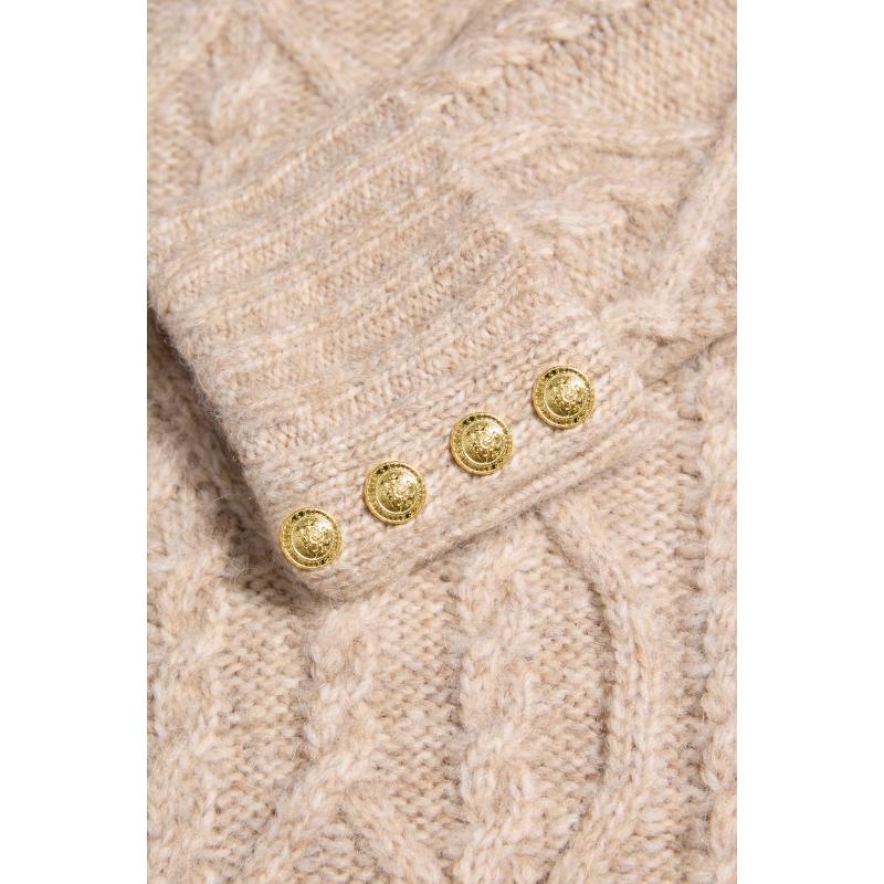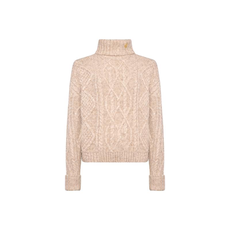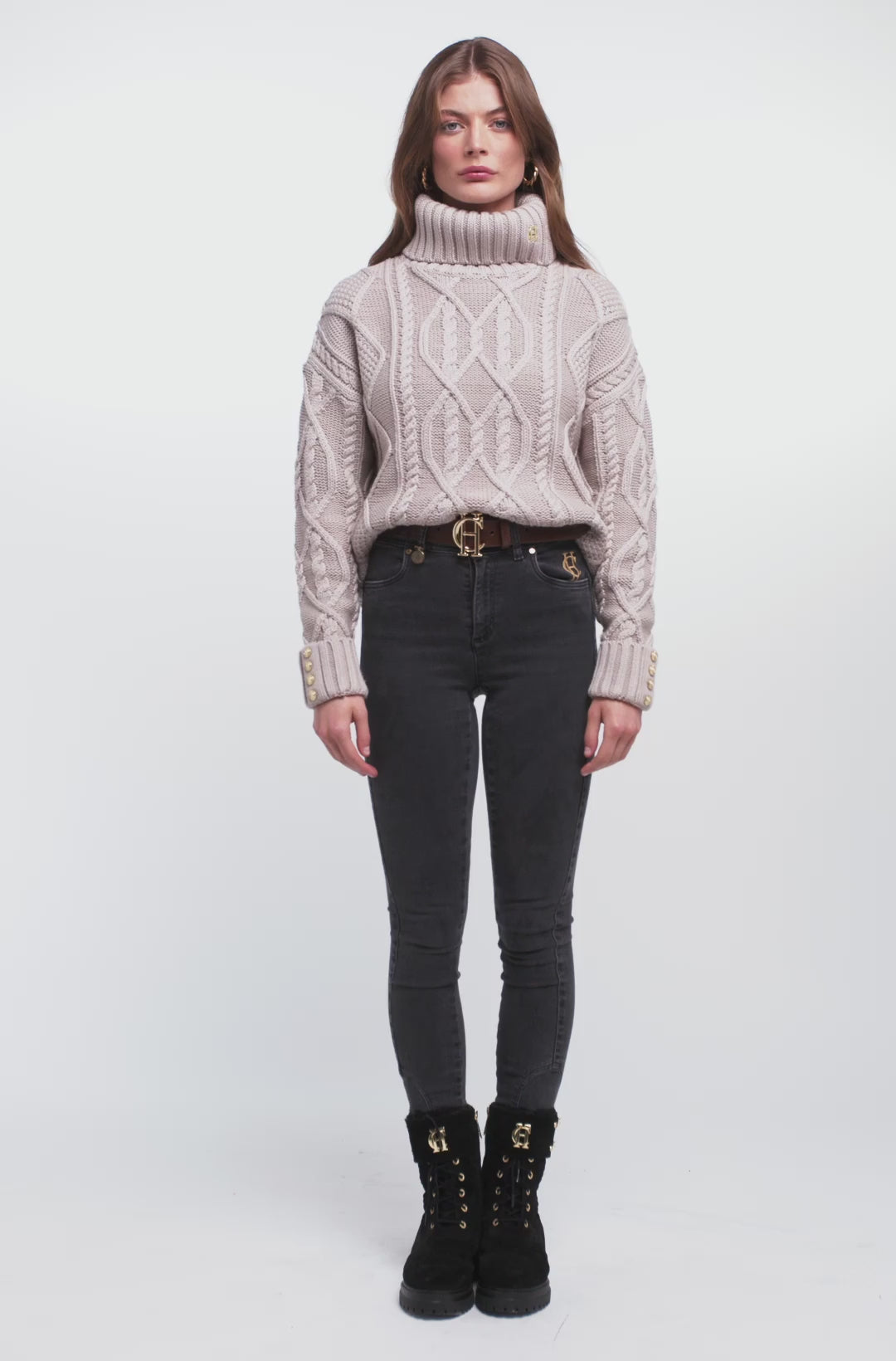 This roll neck knit exemplifies refined knitwear craftsmanship. Constructed from sumptuous yarn enhanced with nuanced multi-tonal colouring, it showcases a contemporary cable knit pattern that adds visual depth and tactile interest. The relaxed boxy silhouette with drop shoulders defines modern ease, whilst signature gold rivets and HC hardware detailing at the collar and cuffs provide sophisticated embellishment. An expertly designed piece that elevates your seasonal wardrobe with understated elegance and versatile styling potential.