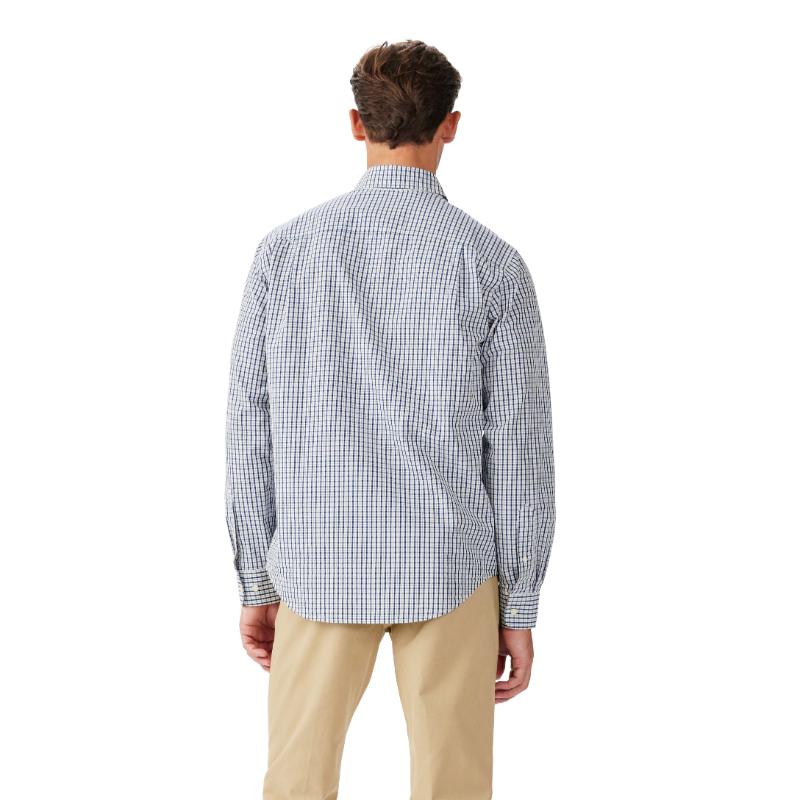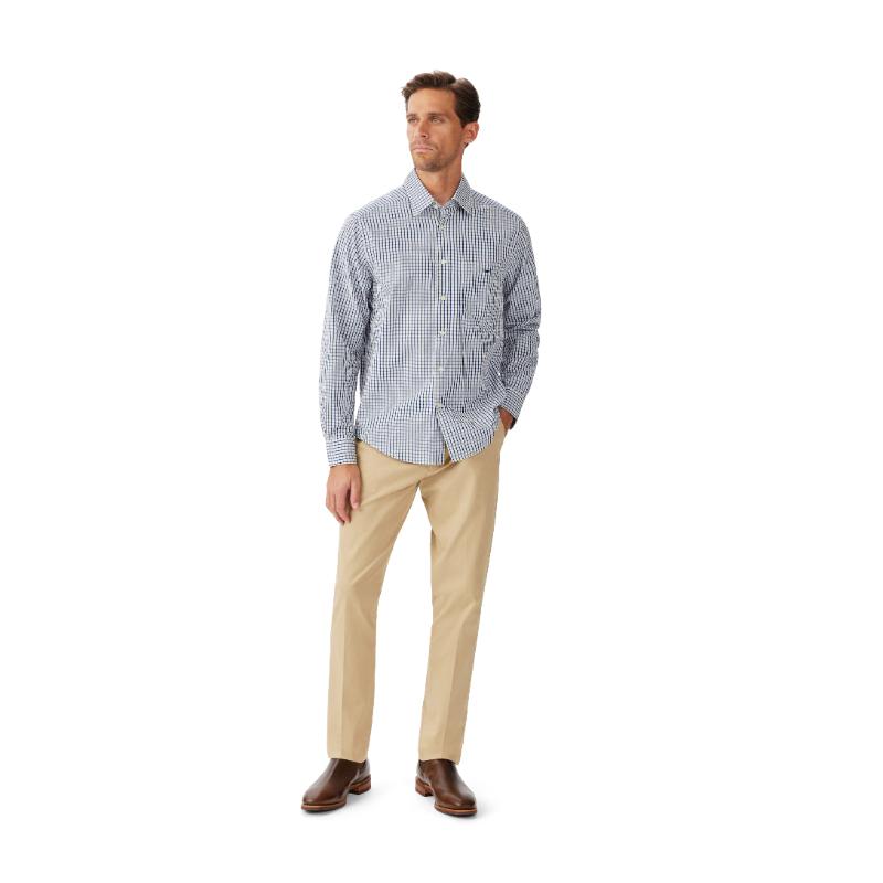 The R.M.Williams Augusta Classic Fit Poplin Men's Shirt features a regular collar with a front placket secured by branded buttons. Its regular full-length sleeves include double-button cuffs for adjustable comfort. Designed with a centre back yoke and side tucks, the shirt offers a classic fit. A single patch pocket on the chest is detailed with contrast Longhorn embroidery, while the curved hem provides a polished finish, showcasing expert craftsmanship and timeless design.