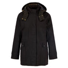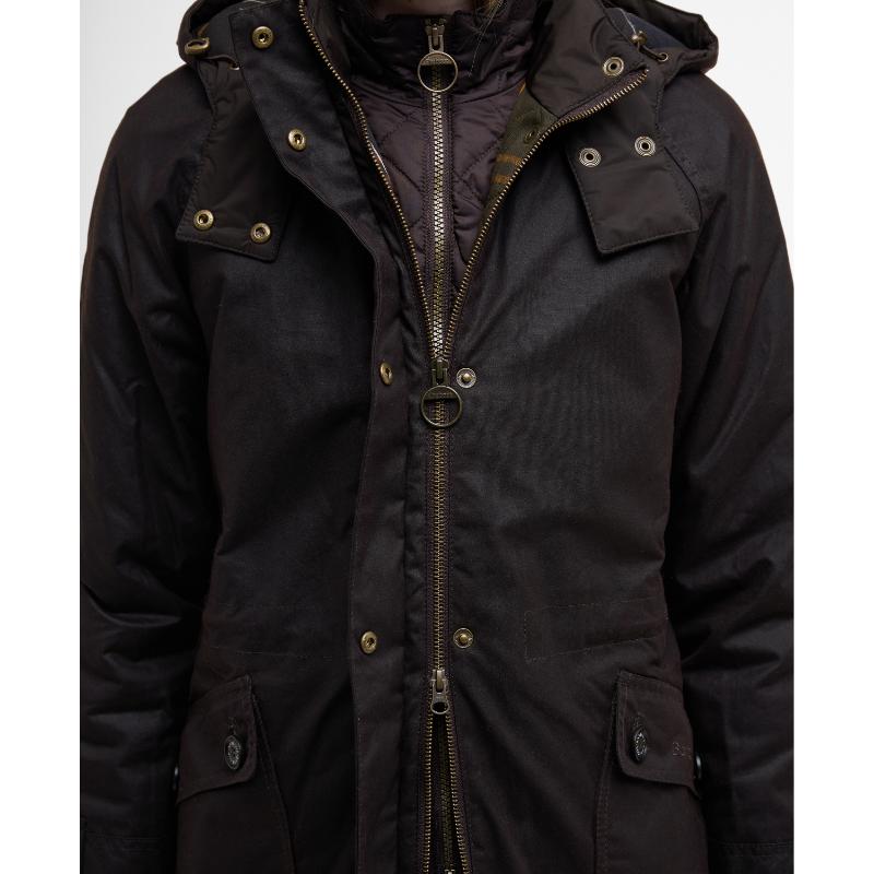 The Barbour Cannich Ladies Wax Jacket is a relaxed mid length parka inspired jacket with fishtail styling. Crafted from a quality waxed cotton outer with iconic Barbour tartan lining, and inner baffle quilted panels to provide superb warmth and insulation around your body. There is a detachable hood for added weather protection, welt pockets, gently shaped waist, and leather trim with classically style gold hardware.