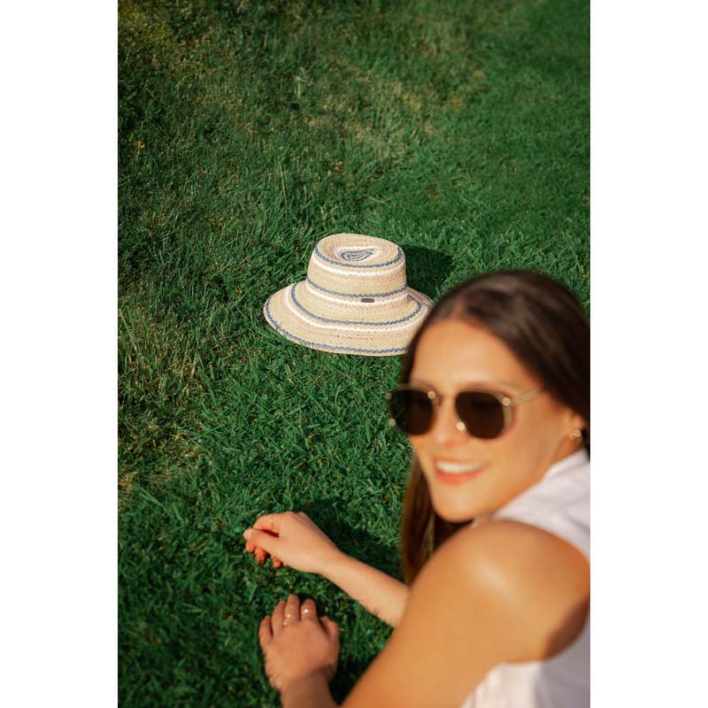 Switch up your summer style with the Barbour Dana Cloche Ladies Summer Hat. This upgraded bucket hat features a playful mock-straw design in pastel hues, perfect for any warm weather outing. Complete with a braided pattern and a signature Barbour logo ID tag, this hat combines playful charm with timeless elegance.