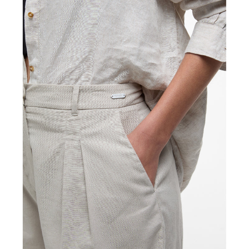 Effortlessly stylish and comfortable, the Barbour Luna Ladies Shorts are a must-have for your summer wardrobe. Made from a blend of cotton and linen, these high waisted tailored shorts feature a wide leg design, pleated front, side seam pockets, back welt pockets, and a slim ID bar on the front waistband. Perfect for any occasion, these shorts offer both style and functionality.