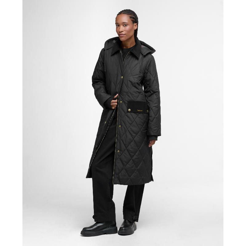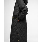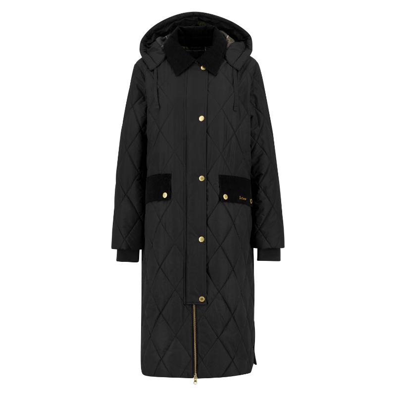 The Barbour Meredith Ladies Quilted Jacket combines heritage style with practical warmth. This longline jacket features a bold four-inch diamond quilt pattern and a detachable hood for added protection. It secures with a stud placket concealing a zip, while extended rib cuffs enhance comfort and block out cold. The tartan-lined hood and buggy lining bring a refined touch of Barbour’s signature heritage, making this jacket a sophisticated choice for cooler days.
