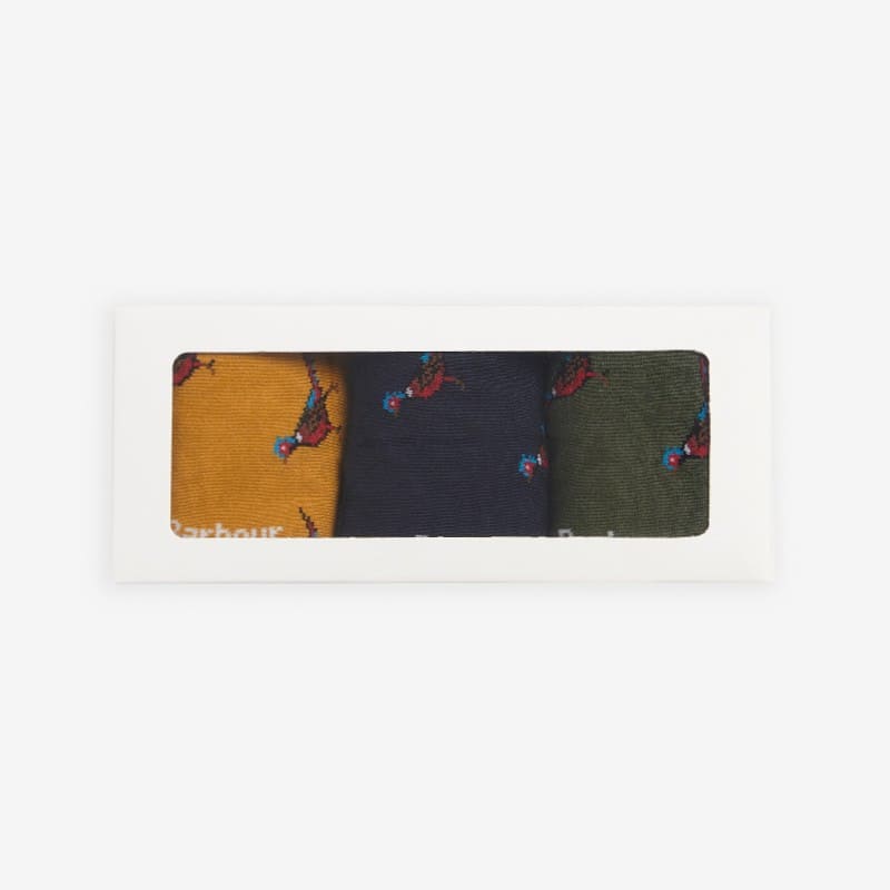 The Barbour Pheasant Mens Socks Gift Box is a pack of 3 lightweight cotton rich socks displaying fun pheasants. Presented in a Barbour branded gift box.