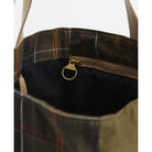 Expertly designed with a unique Barbour patchwork style, this tote seamlessly blends tartan and dry wax panels. Featuring webbing carrying handles and a secure stud closure, it also includes a convenient inner zipped pocket, fixed lanyard, and bottle holder pocket. Carry your essentials in style with this durable and functional tote.