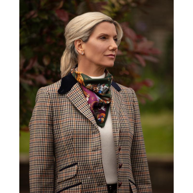 The "It’s a Dog’s Life" Medium Square Silk Scarf celebrates the spirit of versatile hunting breeds, from the noble pointer and loyal labrador to the energetic spaniel and determined retriever. Clare Haggas captures each breed’s unique character with detailed artistry, including spirited terriers and Jack Russells known for their intelligence and tenacity. This hunter green and oxblood red scarf combines elegance with a tribute to these exceptional working dogs. This elegant silk scarf honours beloved hunting dogs, celebrating their importance both at home and in the field. Clare Haggas pays tribute to these admired animals with a design that resonates with dog lovers and outdoor enthusiasts alike.