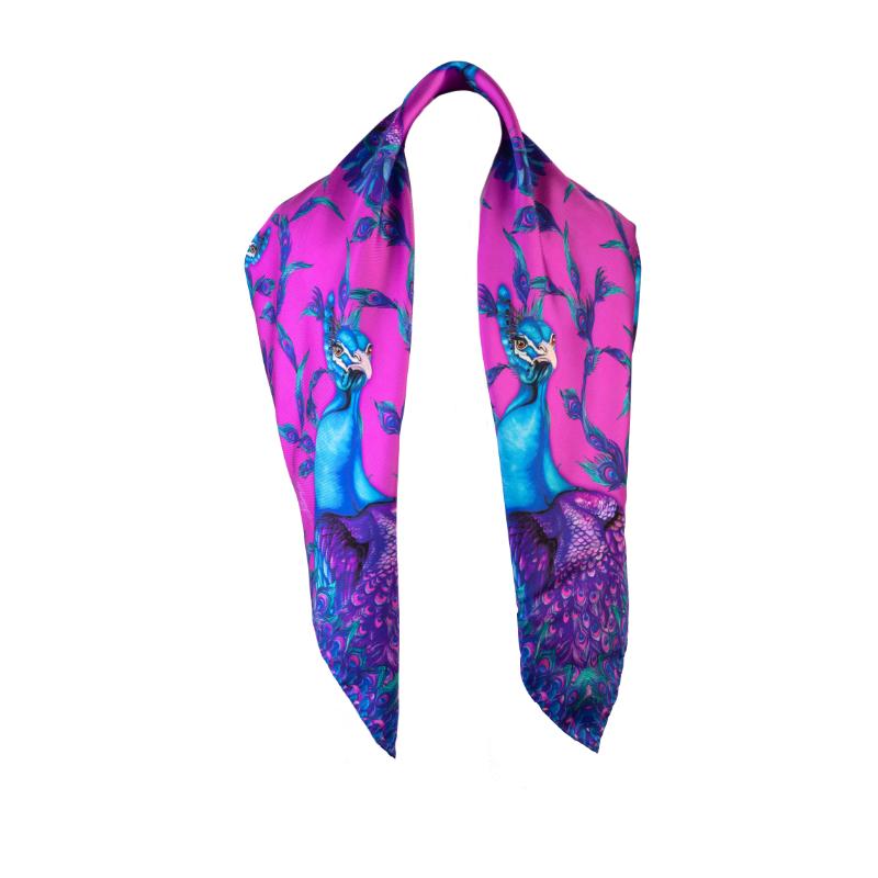 The Clare Haggas Pluming Marvellous Narrow Silk Scarf showcases vibrant peacock artwork set against a radiant Macarena background. Crafted in luxurious silk, this scarf combines bold colour with intricate design, offering a striking accessory that elevates any ensemble with expert artistry and vivid elegance.