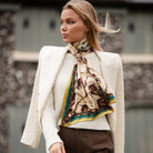 The Clare Haggas Rearing To Go Classic Silk Scarf features a charming equestrian print with majestic rearing horses and a border of bridal leathers. The vibrant colour palette will add a luxurious finishing touch to your outfit and the rectangular shape is ideal for elegantly wrapping or draping around your neck and shoulders. Crafted in England from the finest quality pure silk twill and hand finished with exquisite attention to detail. This beautiful scarf is an accessory for all occasions, whether you're dressing up or aiming for a casual country style.