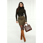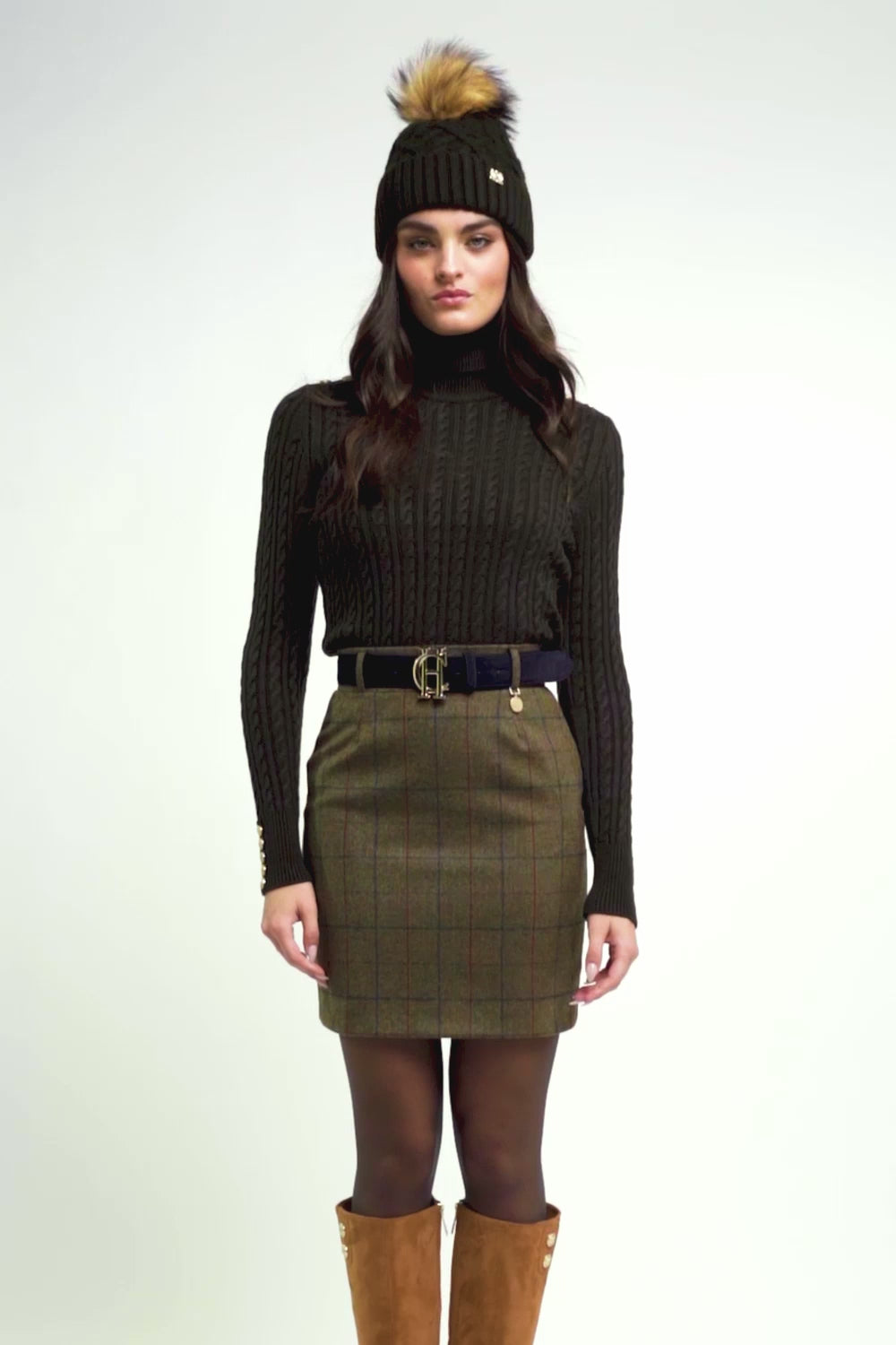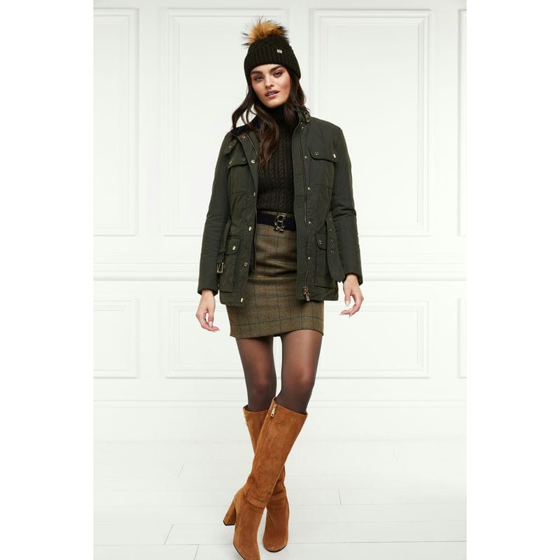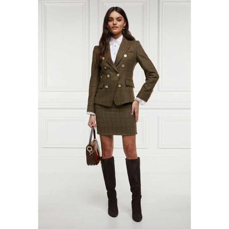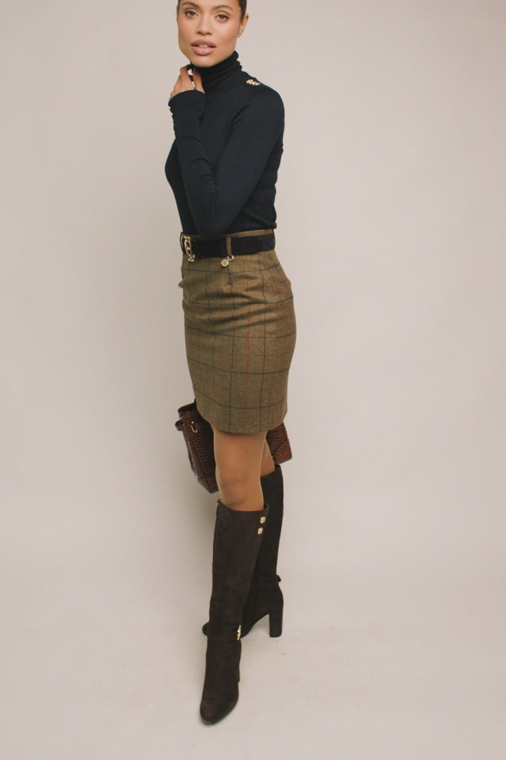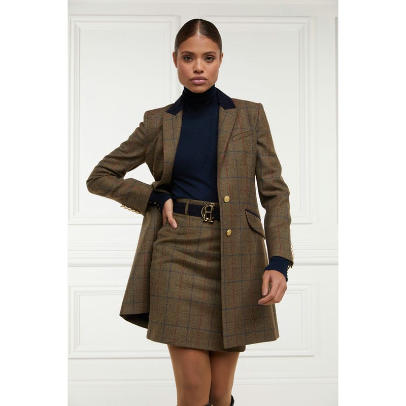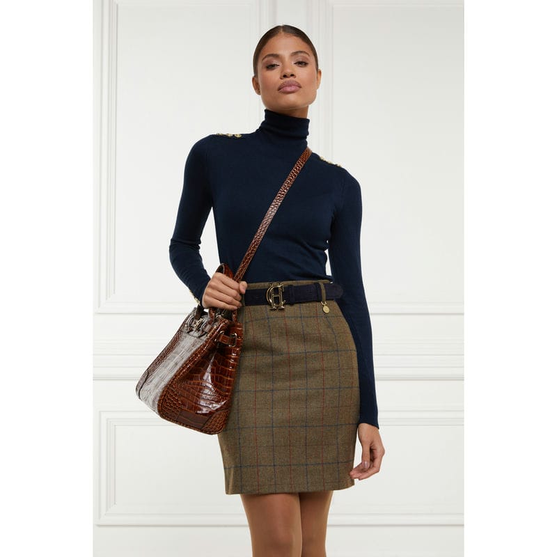 This classic Holland Cooper tweed skirt features tailored lines and is crafted from luxurious tweed. Fully lined and finished with iconic gold Holland Cooper hardware, this timeless classic pencil skirt lends sophisticated style with easy entrance through its concealed back zip and mini length. It is hand-cut in England and crafted with British-woven wools for superior quality.