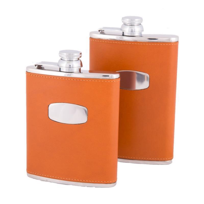 William Powell premier quality leather covered stainless steel hip flask with oval and hinged screw captive top.