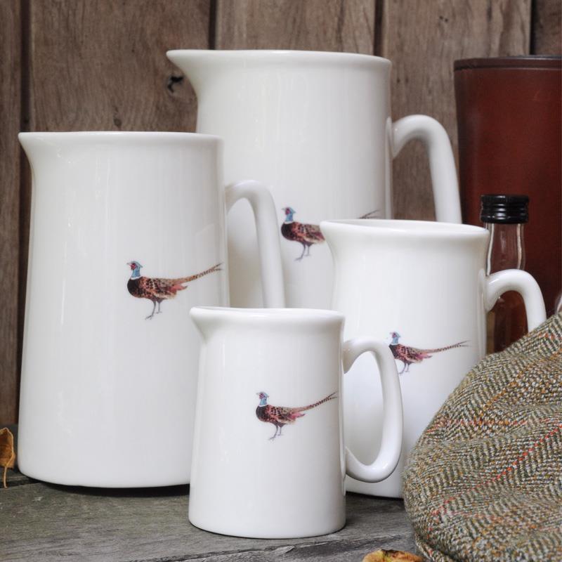 A magnificent male Pheasant stands on the front and back of these fine bone china jugs. There is also a crouching Pheasant on the inside rim at the handle. In four sizes perfect for milk, cream, gravy, custard, water and chocolate sauce or even as a flower vase! Gift boxed.