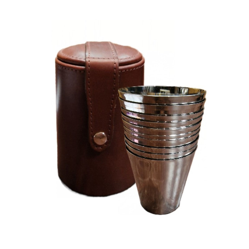 Set of 6 or 10 stainless steel nesting beakers contained in a finest quality hand crafted leather case. The 10 sets can be used as a position finder.