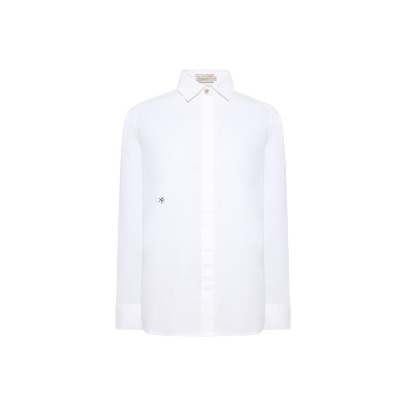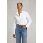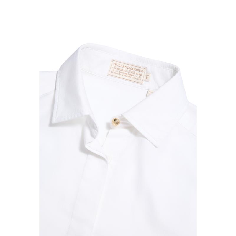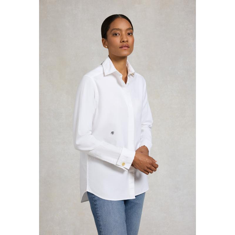 The Holland Cooper Aster Ladies Shirt offers a modern reinterpretation of the classic white shirt with its relaxed, boxy silhouette. It features a sharp collar and a concealed button placket, accentuated by a signature gold HC button at the neckline for a refined finish. Design details like a front pocket, a subtle back pleat, and delicate HC embroidery subtly enhance its tailored appeal. Completed with a gold rivet on the cuff, this versatile shirt transitions effortlessly from casual to smart occasions.