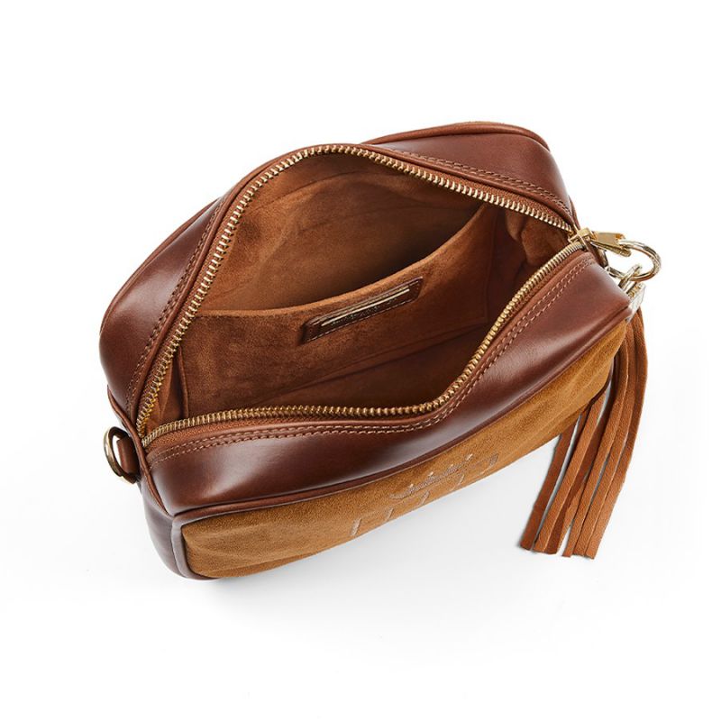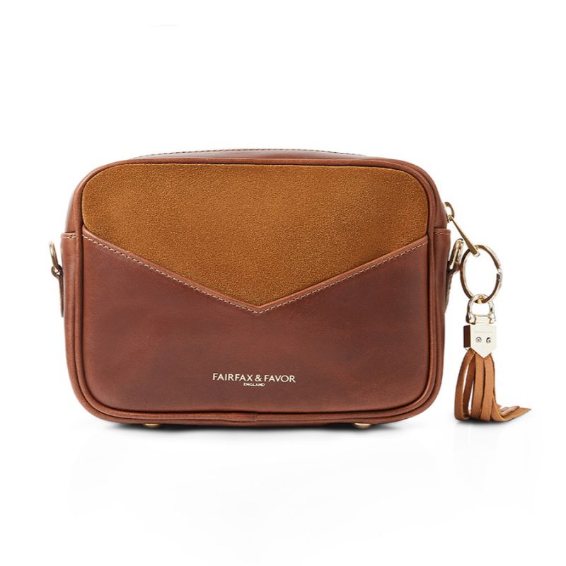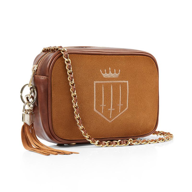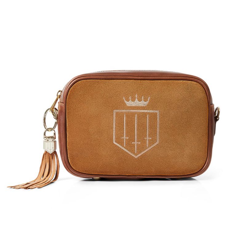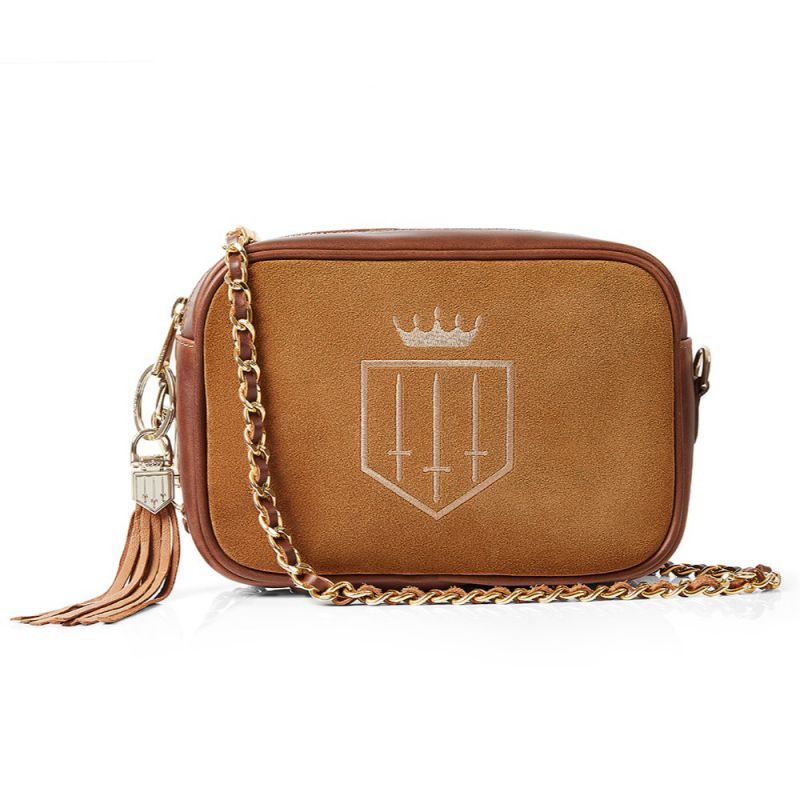The Fairfax & Favor Finsbury Ladies Shoulder Bag is both stylish and superbly practical, an easy to wear option for when you're on the go. Crafted from luxurious suede and leather in a versatile size, big enough to fit all of your essentials with a top zip closure for security. The iconic Fairfax & Favor shield takes centre stage, embroidered onto the front of the bag with matching detachable suede tassel. The useful gold chain and leather strap allows you to wear the Finsbury over your shoulder or as a cross body bag, or even as a clutch as the strap is fully detachable. Featuring a large internal compartment, zipped internal pocket and chevron cut back pocket.